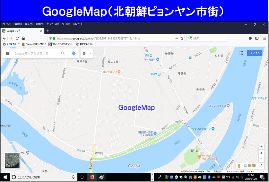 OSMは世界地図なので今話題の北朝鮮のピョンヤン市街地をGoogleMapと比較してみました。GoogleMapでは建物形状がほとんど表示されていないのに対してOSMは多くの建物が見受けられました。