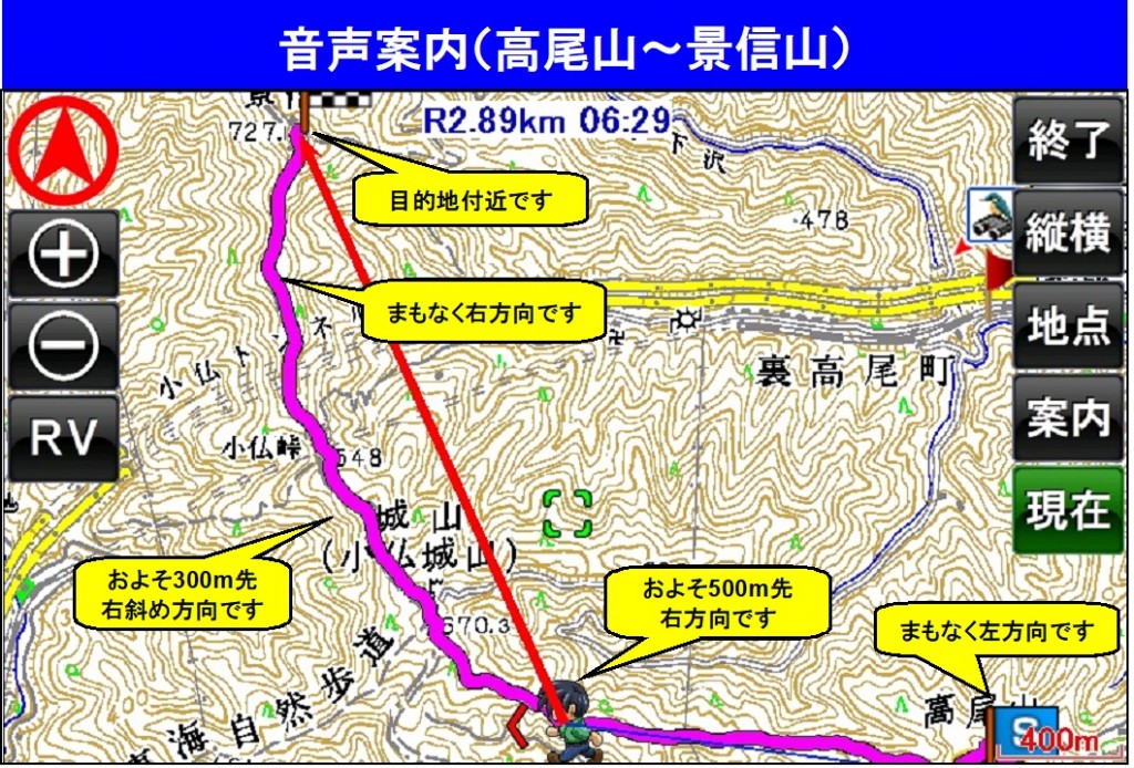 カーナビでは当たり前のように画面と音声が連動して道案内をしますが、ハンディGPSでは地図の上にルートを引いて現在地ポイントを表示するだけのものが多いようです。ここでは私が以前開発したアーストレッキングナビGXという音声案内付GPS専用機の例がありますので動画をご覧ください。高尾山レジャーセンターから景信山までの約5kmのコースです。(http://www.asahimap.co.jp/HOME/RouteGuide.mov)