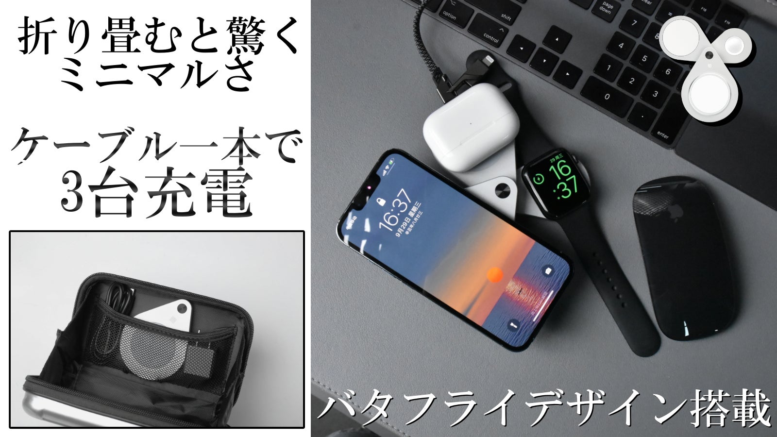 「JI 03」 は3in1で最大15wの高速充電も搭載。バタフイデザインで一本のケーブルで3台の充電も可能!