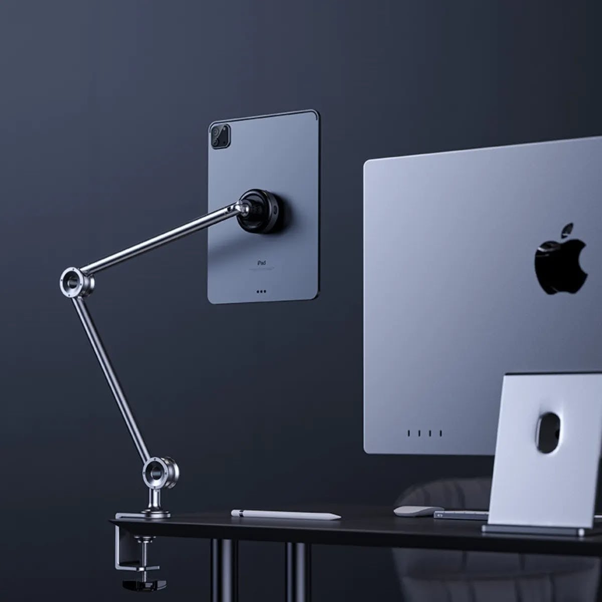タブレットPCやスマホをスタンドに近づけるだけで自動的に真空吸着吸着するので脱着が簡単。本体は丈夫なアルミ合金製で、高さ調節・方向調節だけではなく角度調節も可能!