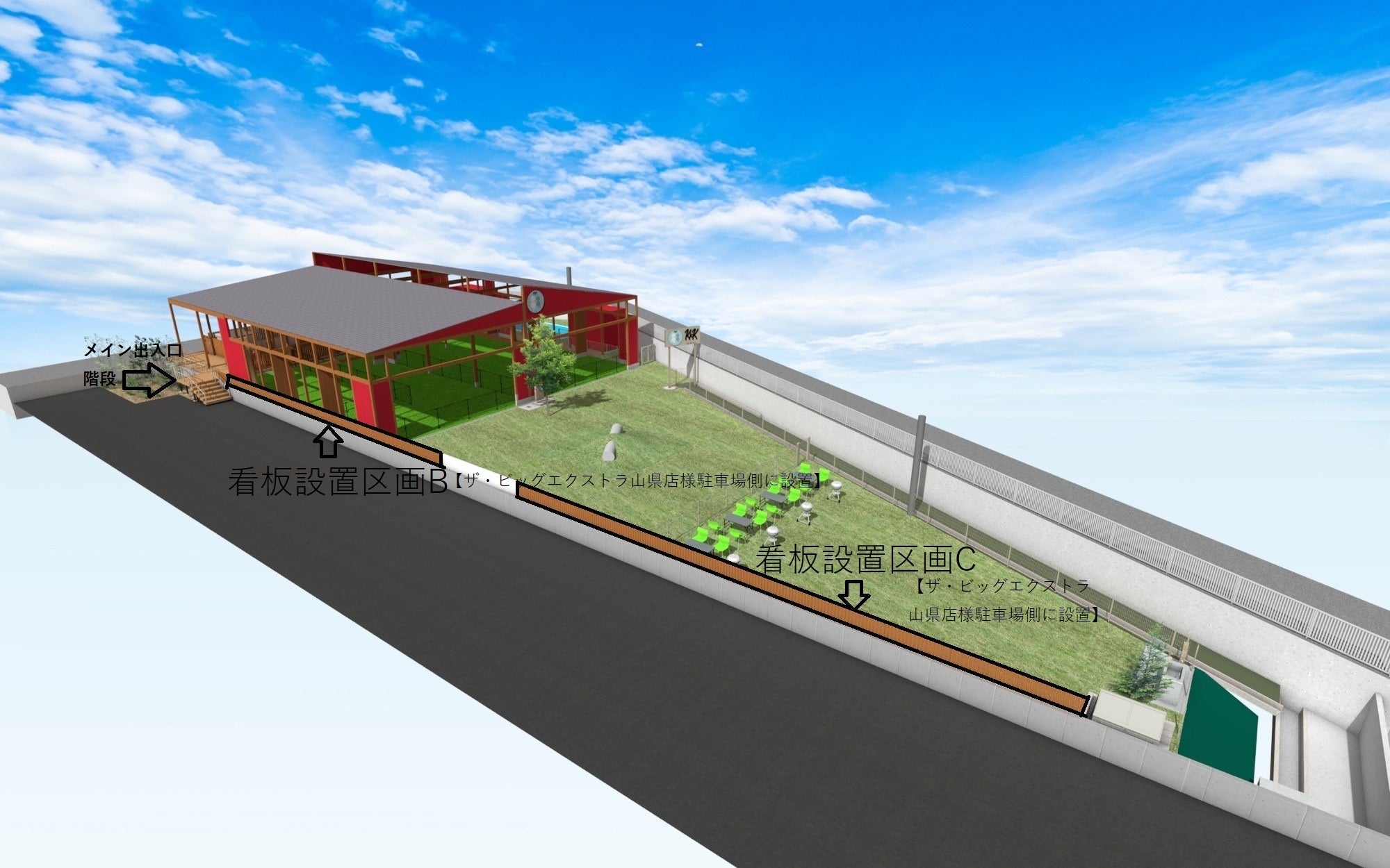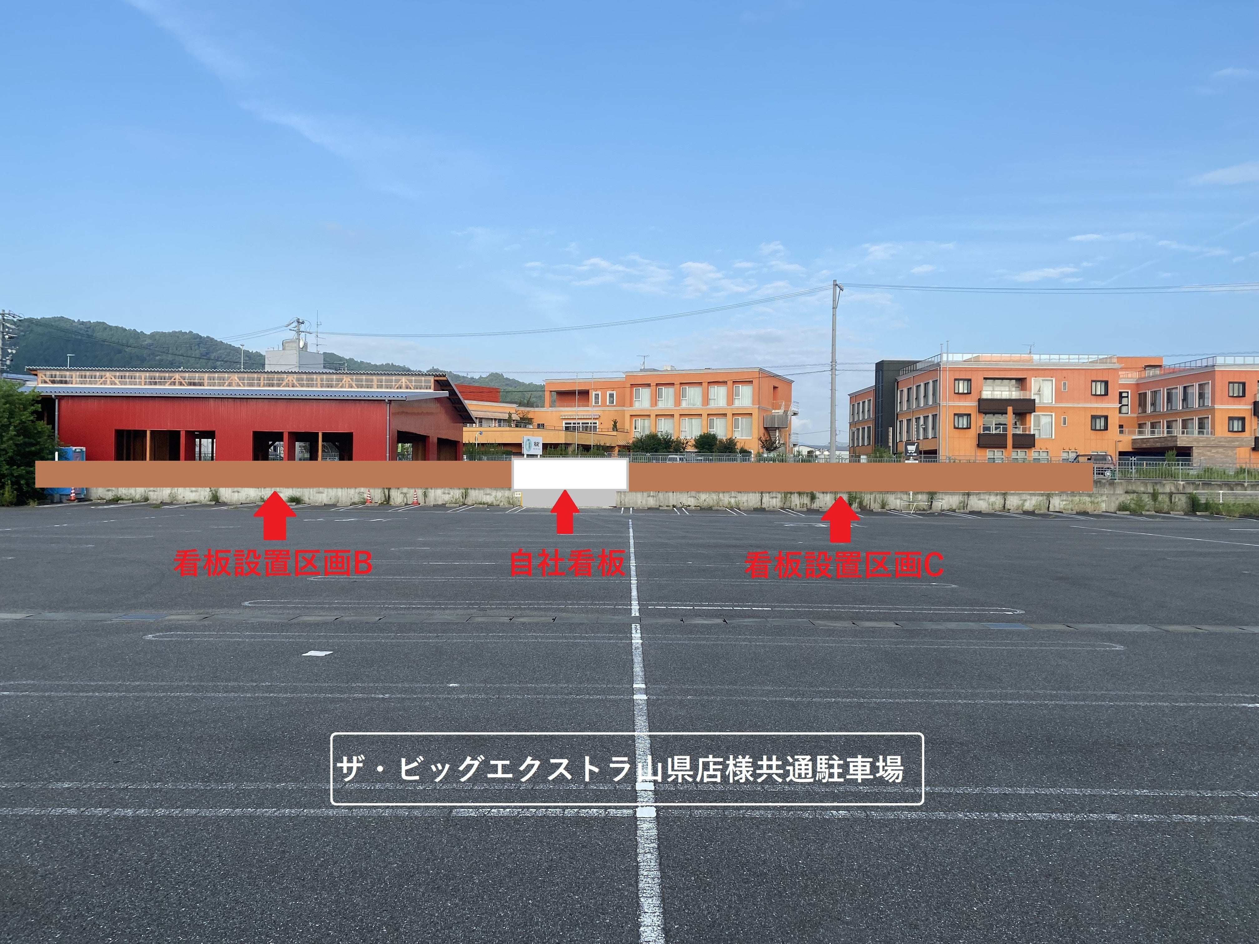 看板サイズ 縦500㎜×横1,000㎜契約期間3ヶ月(3ヶ月経過後に更新いただける場合は以降1年更新 月額22,000円)制作費・設置費33,000円別途必要・指定フォーマットでのデータ入稿必要※施設東側フェンスの看板設置区画Bより北側のエリア(ザ・ビッグエクストラ山県店様駐車場側)に看板を設置します。区画内掲示場所については先着順となります。