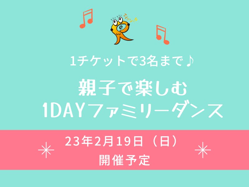 日程:2023年2月19日(日) @都内某所のダンススタジオにて行います。1DAYの親子ファミリーダンスを体験してみませんか!?一緒にダンスを通じて家族交流を!お子さんが頑張っているダンスをこの機会に親御さんもトライしてみませんか!?ダンスに興味のある方であればどなたでもご参加OKです♪1チケットあたり3,500円で「3名まで」ご家族やご兄弟で一緒にご参加ください!レッスンは聞き馴染みのある流行りの曲で行う予定ですので、楽しさを一番にダンスを楽しみましょう!イベント時間は75分程度を予定しています。