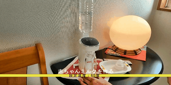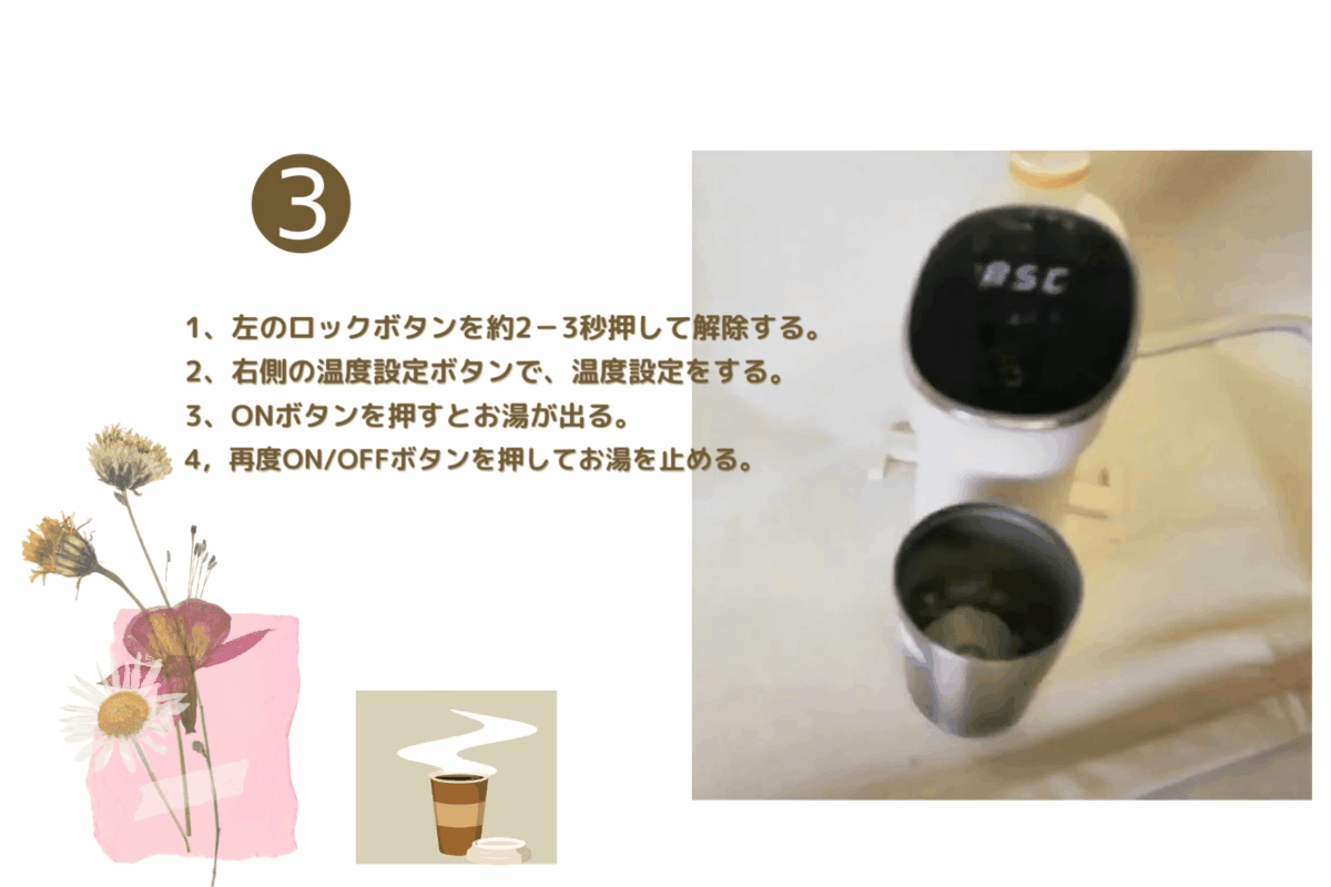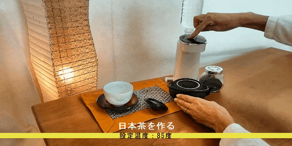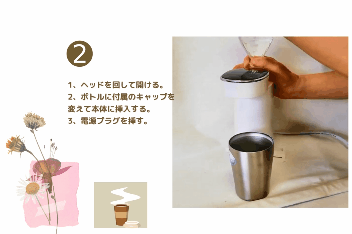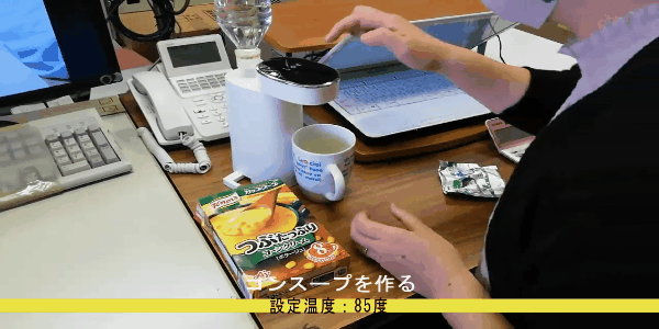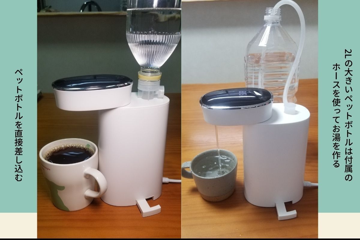ペットボトルを差し込み、電源プラグを挿し、ボタンを押せば、すぐお湯が出ます!