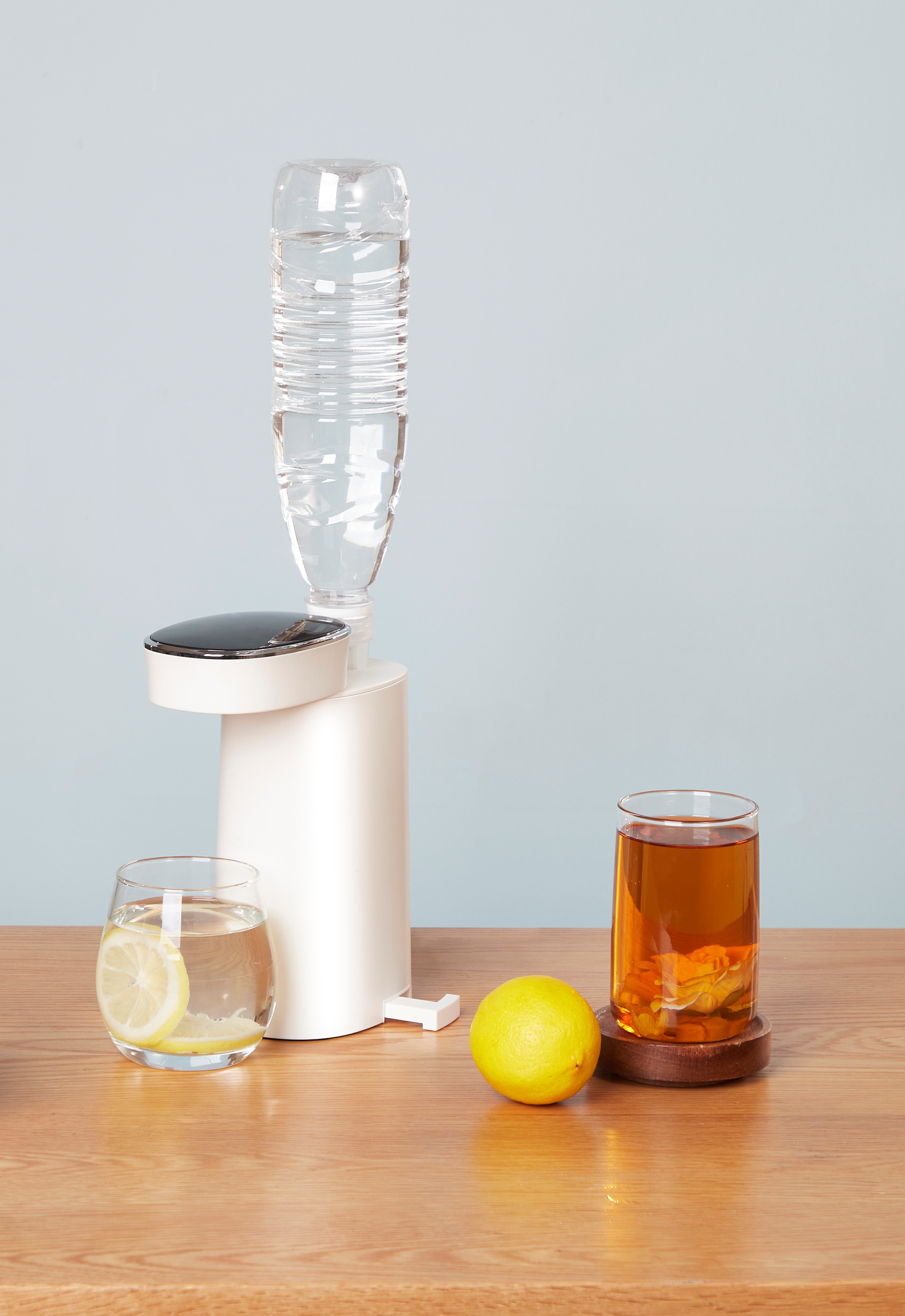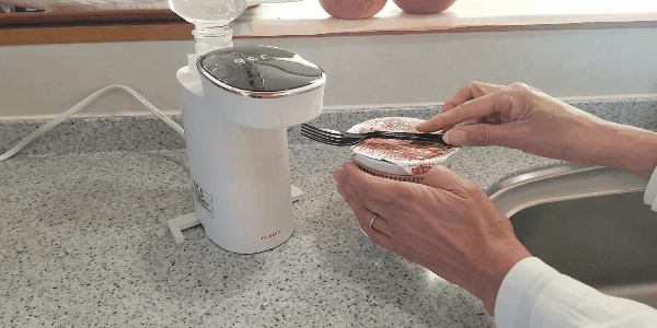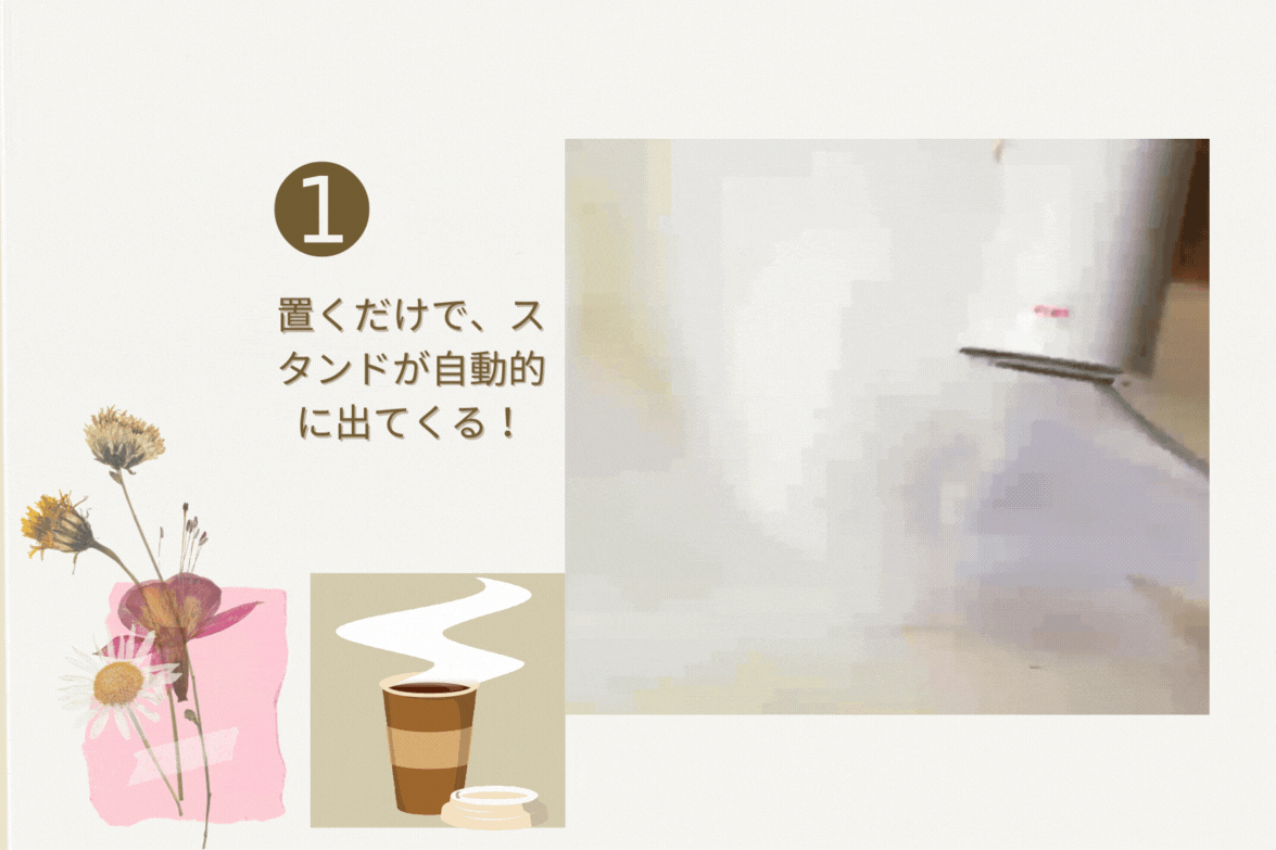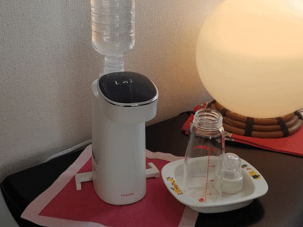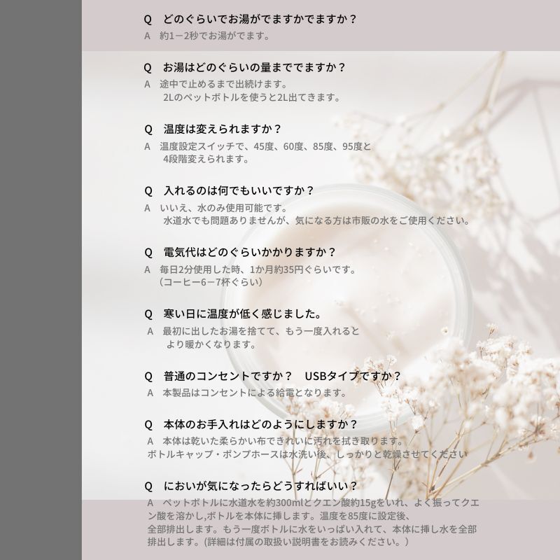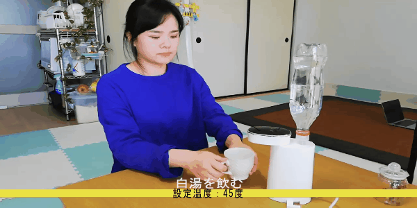 ペットボトルを差し込み、電源プラグを挿し、ボタンを押せば、すぐお湯が出ます!