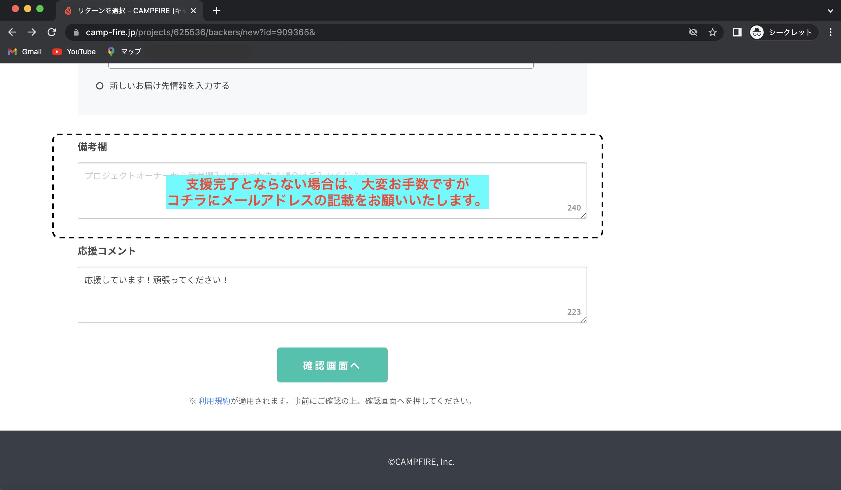 2022/10/12 19:16ご支援いただいた皆様、これからご支援をご予定されている皆様いつも大変お世話になっております。Bayside Hills Coffee林です。まず初めに、ご支援いただきました皆様、改めまして、ご支援頂き本当にありがとうございます。心より御礼申し上げます。さて、最初の投稿がこんな形となってしまい申し訳ありません。表題の件につきまして、ご支援者様より連絡を頂き、支援ボタンが押せず、支援完了ができないという件が発生しております。プロジェクト終了後にメールでのご連絡を検討しており取り、メールアドレス記載をリクエストさせて頂きました。ラインや他のアカウント経由でCAMPFIREへログインされた場合、メールアドレス記載なしで進めるかと思いますが、CAMPFIRE上で新しくアカウントを作られた場合、「支援ボタン」が押せない場合があります。大変分かりづらく申し訳ありませんが、画面下部にある備考欄にメールアドレス記載をしていただくと支援ボタンが押すことができ、支援完了となります。ご不便とご面倒をおかけしており申し訳ありませんが引き続きどうぞよろしくお願いいたします。Bayside Hills Coffee 林 もっと見る