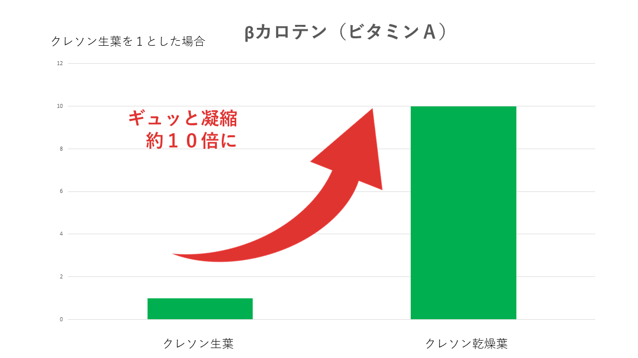 ●ある一定に設定された温度管理の下、乾燥すると「クレソンの栄養成分」は、約10倍に濃縮。