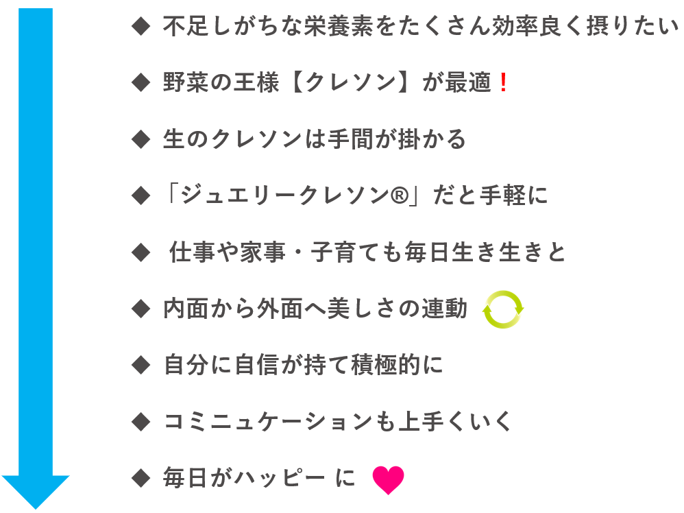 ところが、この『クレソン』と出会ってからは、「外面」・「内面」両面に対し体の内側からアプローチしてくれることに気づき、その素晴らしさを同じ悩みを持つ女性に是非伝えたいと思い始めました。