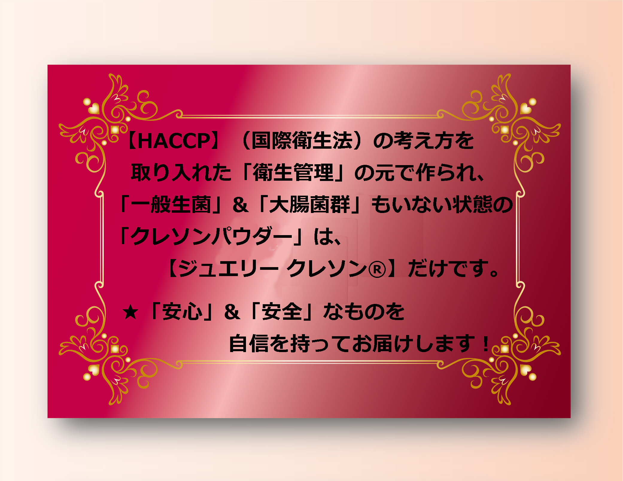 jewelry ジュエリークレソン®は、「大腸菌群」に関しても陰性となっております。