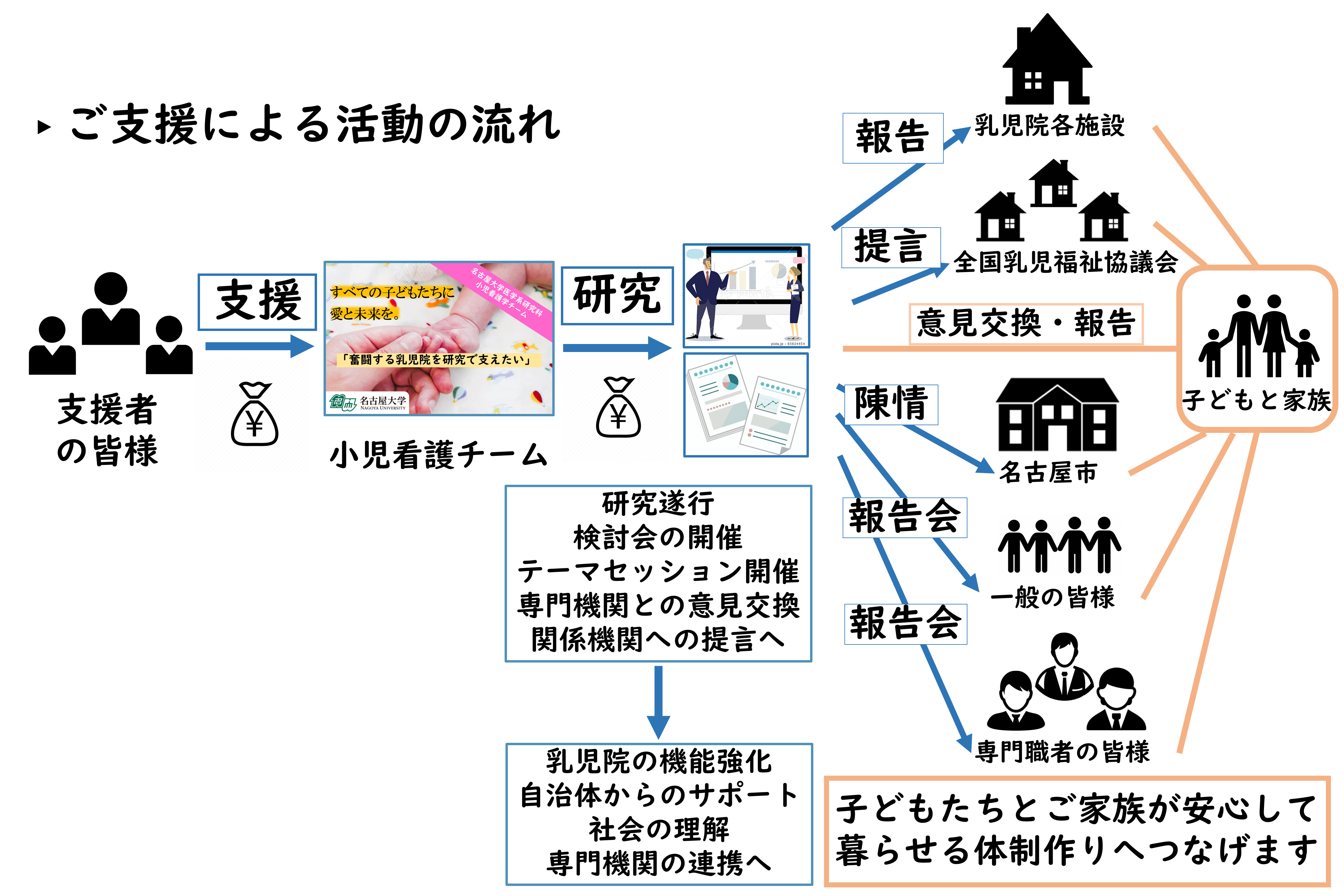 乳児院の機能強化という課題の喫緊性から、愛知県内の乳児院や全国乳児福祉協議会のご協力を得て、私たちの研究はすでに始まっています。この社会課題を広く共有し、一刻も早く具体的な戦略を練るために私たちは動き出しています。乳児院で奮闘する専門職の方々のために、乳児院で暮らす子どもたちとそのご家族のために、これから生まれてくる子どもたちのために、どうか応援をお願いいたします!