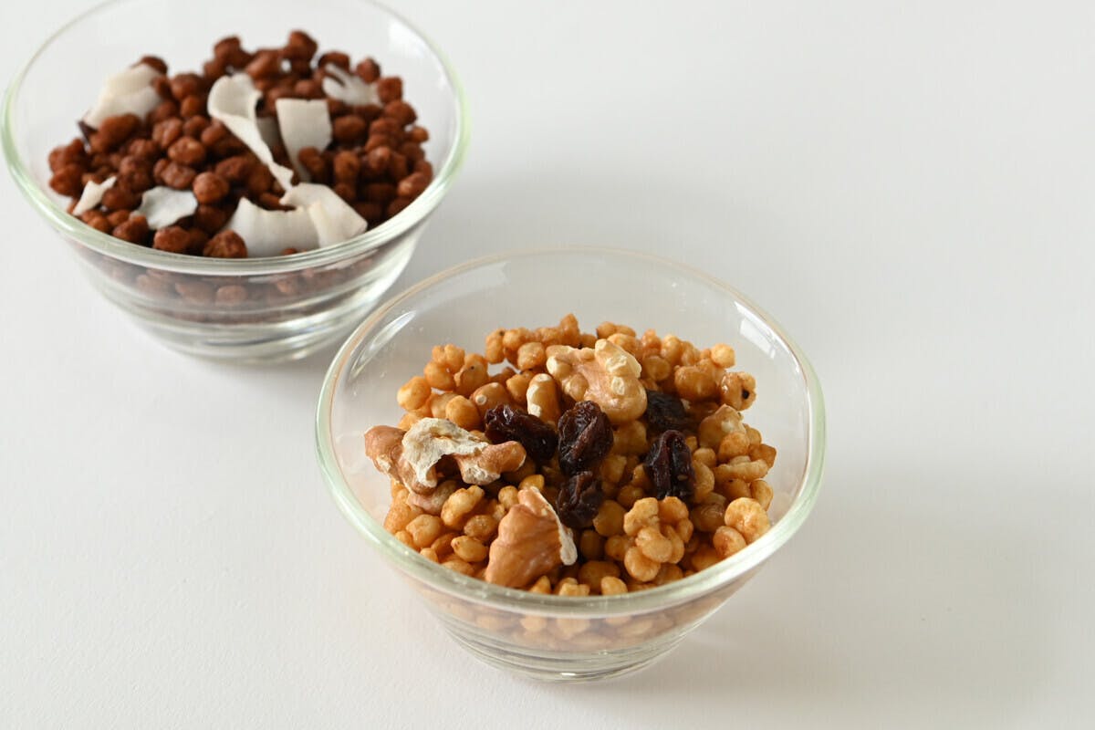 ハトムギグラノーラは「プレーン」「チョコ」の2種類。朝食やティータイムにそのままお召し上がりいただけます。