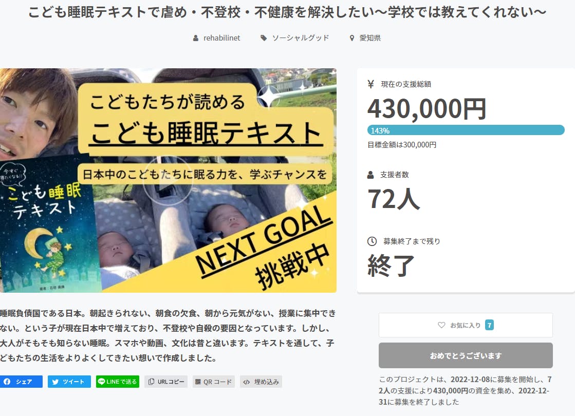 2023/01/01 22:06クラファン期間が終了しました。ホント、ありがとうございました!!!目標が達成し、ネクストゴールを設定し、ネクストゴールは無理かな・・・って正直思っていたら・・・みなさんのおかげで達成し!!2022年の最後にめちゃくちゃ良い気持ちになり、そのまま寝ました。笑嬉しかったです。いくつかいただいた質問なのですが、「期間内しかテキスト買えませんか?」これは「買えます!」発送はクラファンの方がもちろん先行なので先ですが、5月くらいには発送予定です。私のオンラインショップから買えます。https://optimalsleep.official.ec/ぜひチェックいただけたら嬉しいです☆現在テキスト制作真っ只中です。1月4日にはデザイナーさんに原稿を送って、その数日後には打ち合わせです。私自身もどんなものになるのか・・・デザインセンスがない私はプロがつくってくれるものが楽しみです☆あと、「サインください」と言ってくださる方も数名いらっしゃいました。「石垣でいいのでしょうか・・・?」でも言っていただいたことが嬉しく。現在これも人にお願いしています☆美術2の私では難しいので、ここは人にお願いしています。サインの練習も春までにします!!無事クラファンが終わったのですが、ここから本格的にテキストを制作するので、春までのお楽しみにしてくださいね。それまでにも、たくさんの方にこの「こども睡眠テキスト」の存在を知ってほしいです。私のSNSで随時報告していきます。Instagram→ https://www.instagram.com/gaki_sleepyogaotTwitter→ https://twitter.com/gaki0846Facebook→ https://www.facebook.com/takayasu373宜しくお願い致します。改めまして、ご支援いただいた方情報をシェアしていただたい方々ホントありがとうございました。【日本中のこどもたちに眠る力を学ぶチャンスを】これらを拡大するためにもこれからも頑張ります!!!再度、応援を宜しくお願い致します!!!!!!!!! もっと見る表紙ができあがってきました