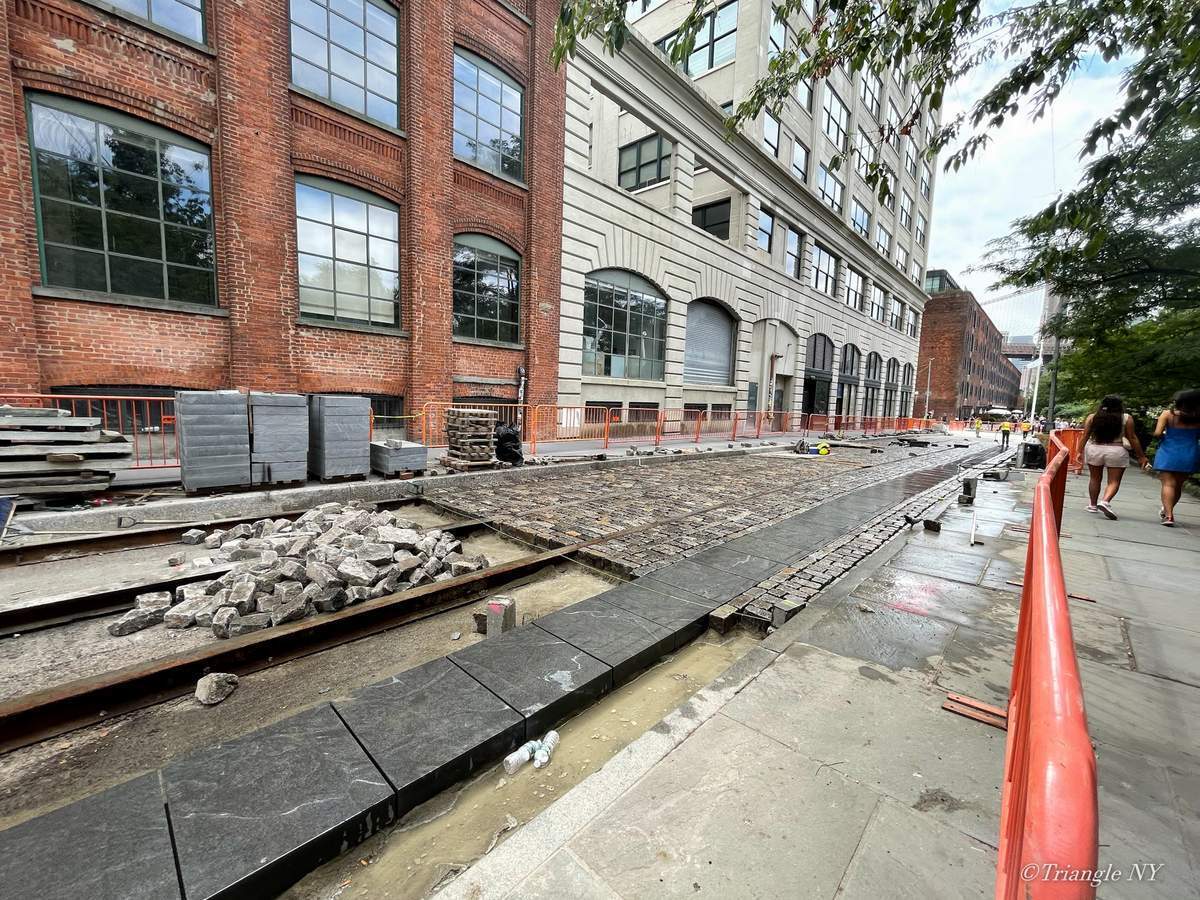 まず一つ目、フォーカスされているのは古いアパートメント、この街には歴史的な建築デザインの建物が数多く、こういった建物を残し続けることで街の魅力を作り出してくれています。次に二つ目、そのアパートの右にある改修工事の外装。先程話したの歴史的建物の改修工事がマンハッタンでは至る所で見受けられます。普段生活をしておりますと、この工事現場で歩道が汚い、また封鎖されていたり、現場の騒音など不便なことが多々あります。写真を撮る時は被写体にフォーカスさせるため映り込まないように普段は構図から外したりします。ただ、ニューヨークという街を思い出す時、この改修工事の外装が一つのキーになってくれたりもします。”世界の中心”と呼ばれる街が日常では非常に不便な街であることを表現するためにあえて構図に入れました。3つ目、水溜りに透けて見える路上の石畳。数こそ少なくなってきていますが、一部の場所などは石畳が崩れると、アスファルトに変えずにわざわざもう一度石畳を貼り変えてまで残そうと改修工事を行なっているところもあります。下の写真のような感じです。ニューヨークにはなくてはならない景観の一つですので構図に入れました。