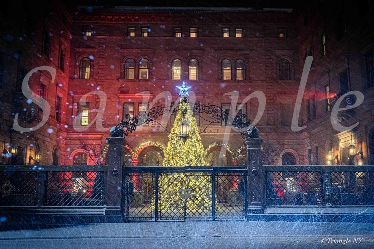 カレンダー12月の写真は激しい風と厳しく冷たい吹雪の中、赤くライトアップされた色合いの中に煌めくクリスマスツリーが温かさを表現し、吹雪には負けない強いニューヨーカーを美しさで表した1カットになります。この時は建物の赤い色が緑に変わったりとしていたのですが、赤色を12月の1枚にセレクトしました。