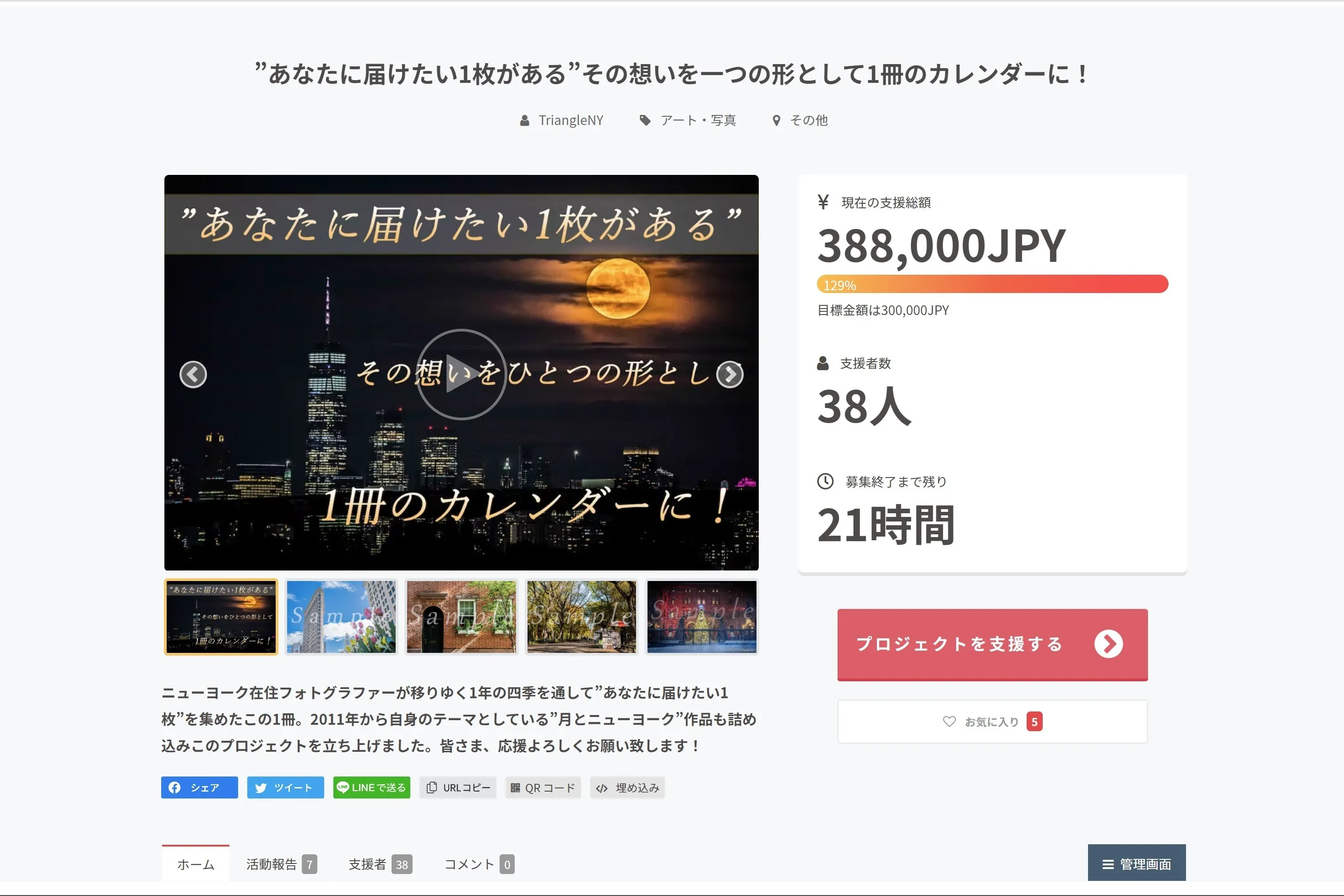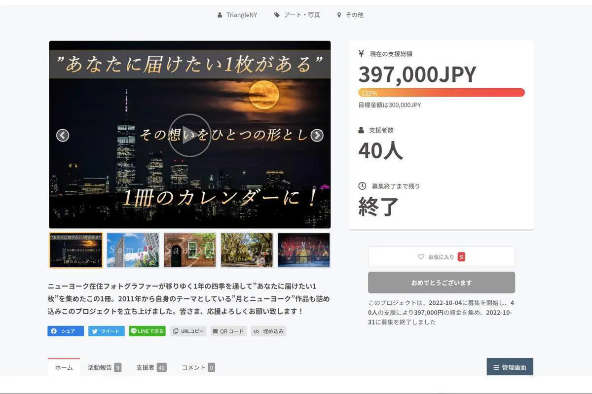 クラウドファンディングプロジェクトは今年で3年目になります。2020年3月22日(日)、コロナ禍でニューヨークがロックダウンし何も出来なかった時に、「私の撮影した写真でニューヨークが好きな人達を励まそう」と立ち上げたプロジェクトで逆に私が多くの方々に励まされ、支えられた記憶があります。そして、あれから2年が経ちました。私がフォトグラファーの活動を始めて12年間の中でニューヨークという舞台で日々起こる偶然や奇跡、中々普段見ることができない一瞬を1年間の四季を通じて集め、その一枚一枚を”あなたに届けたい”、そういう想いから今回のプロジェクトを立ち上げました。このプロジェクトは「All in」方式です、目標金額に達成しなくとも実施致します。「ニューヨークという街」を舞台に起こる希少な出来事を1冊に凝縮したカレンダーで皆さまの生活が少しでも潤えば、それに勝る喜びはございません、ぜひよろしくお願い致します。