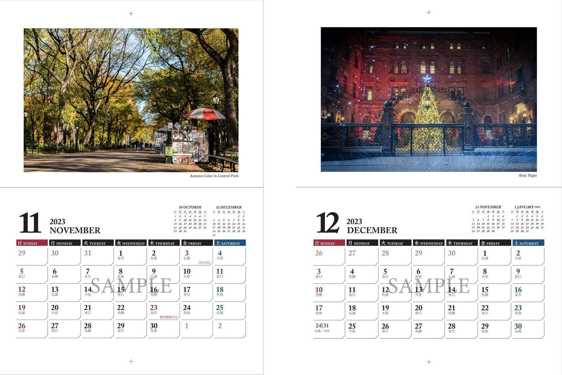 カレンダー12月の写真は激しい風と厳しく冷たい吹雪の中、赤くライトアップされた色合いの中に煌めくクリスマスツリーが温かさを表現し、吹雪には負けない強いニューヨーカーを美しさで表した1カットになります。この時は建物の赤い色が緑に変わったりとしていたのですが、赤色を12月の1枚にセレクトしました。