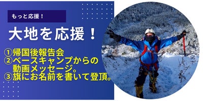 2023年 10月31日〜1月31日 クラウドファンディング公開期間 2024年 4月10日 日本出発 2024年 5月15日 エベレスト登頂 2024年 6月 3日 無事日本帰国