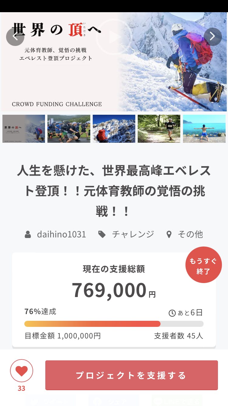 現在¥769000、45人の方が支援して下さり、残り6日で目標金額まで¥231,000になりました。