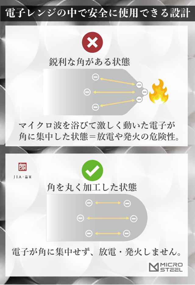 A. ステンレスが電子レンジで使えるかどうか、それは2つの要素「素材」と「形状」に関係しています。