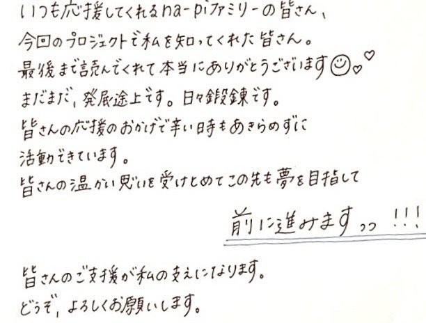 つらいときも、皆さんの応援があるから前に進めます。皆さんのおかげで今のna-piがいます。素直にありがとうの気持ちを伝えよう!とカメラの前に立ったら、めっちゃ笑顔になりました。
