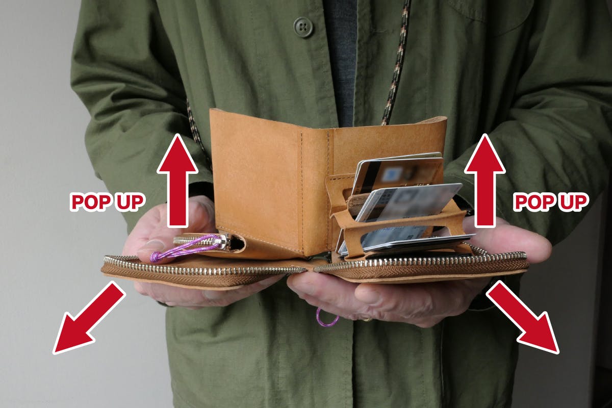 ファスナーを開けると『ガバッ』と大きく開き札入れ、カード、コイン部分がポップアップします。