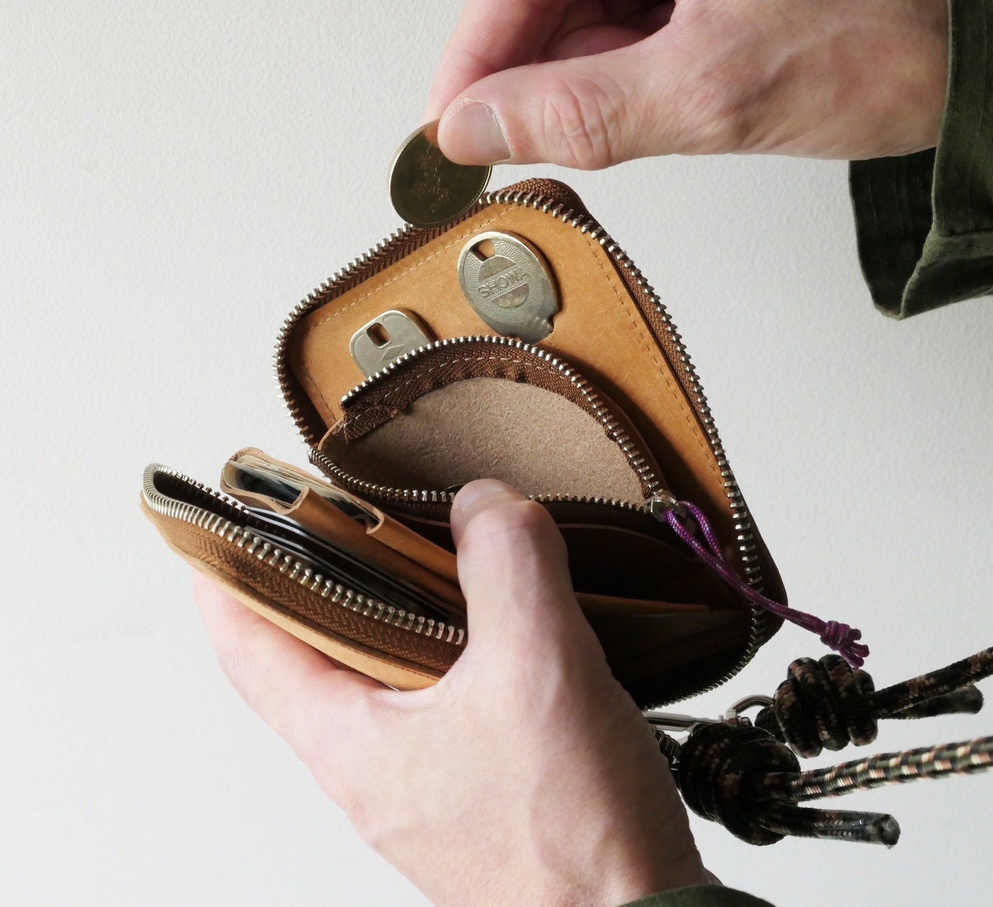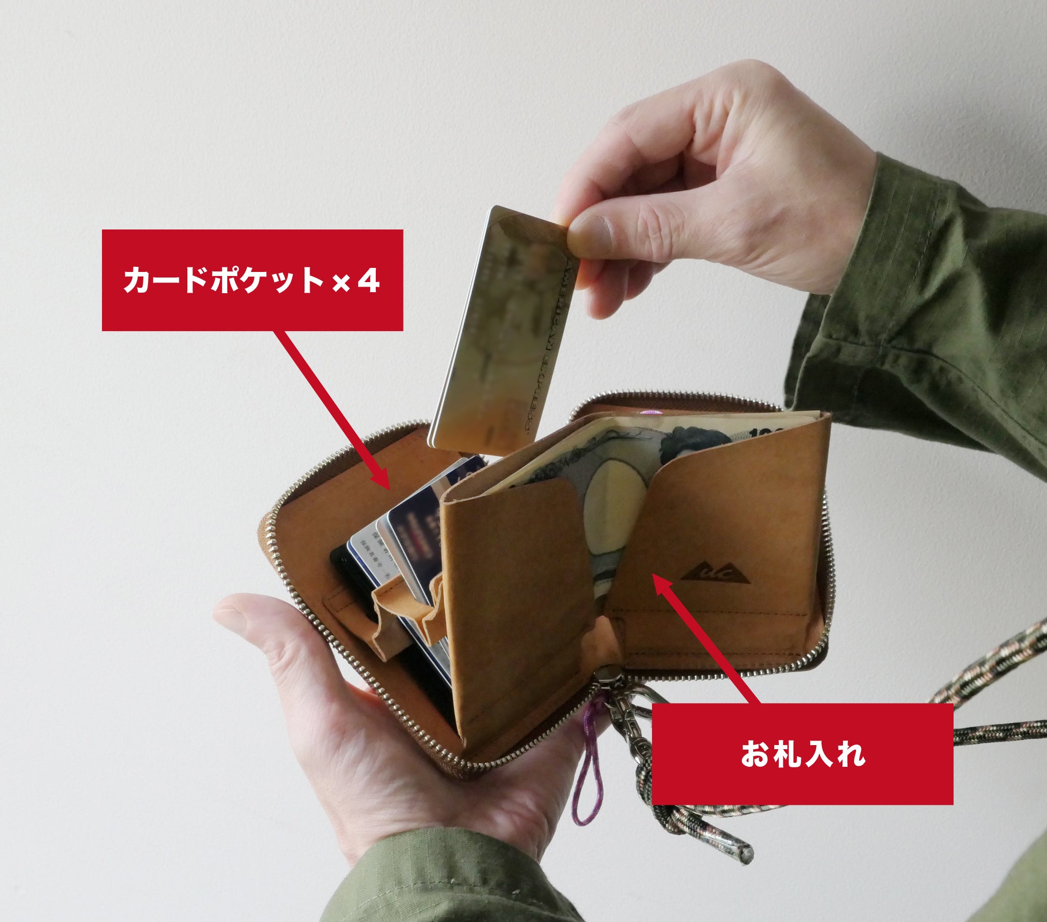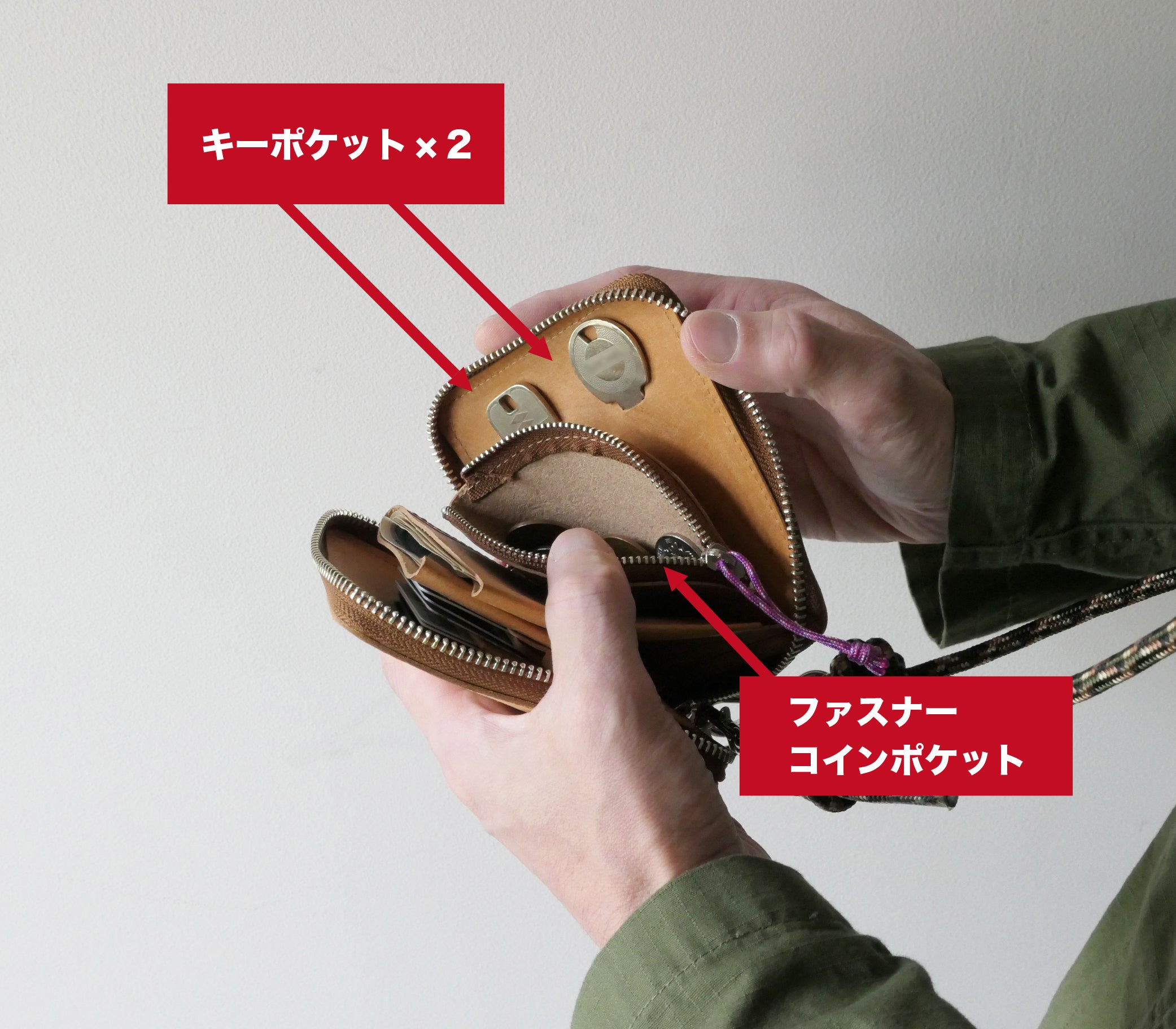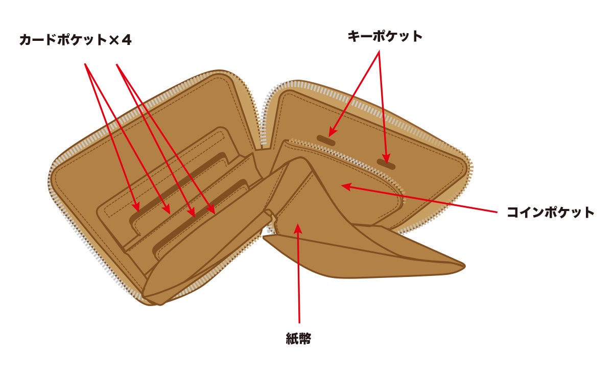 【 製品仕様 】カードポケット × 4、キーポケット × 2、ファスナー付きコインポケット × 1、札入れ × 1