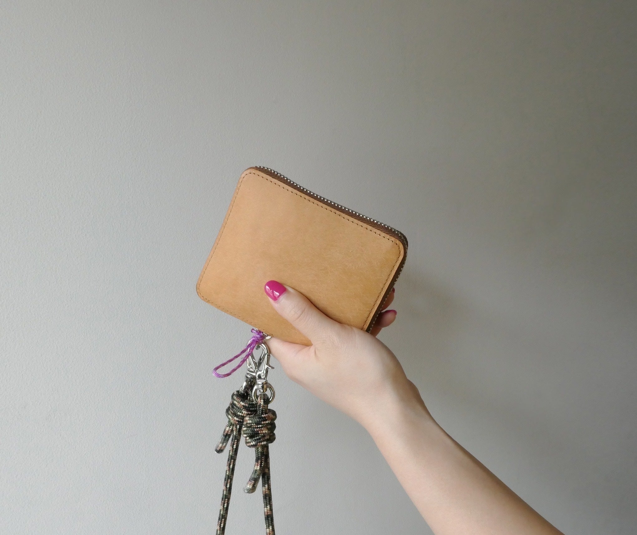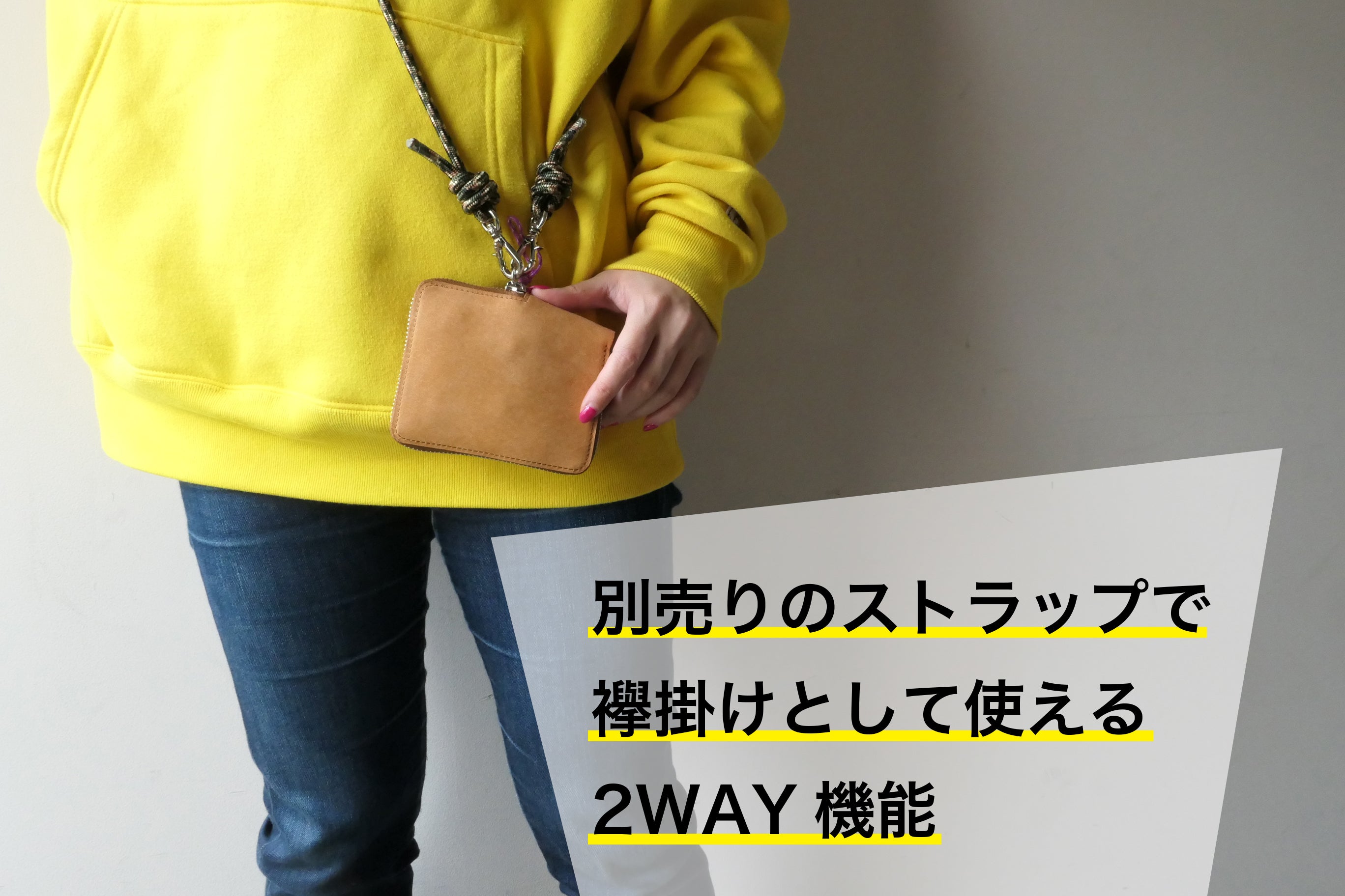 ファスナースライダーに付属している丸カンに別売りのストラップ等を取り付けて襷掛け仕様としてもご利用いただけます。
