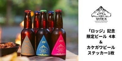【「ロッジ」限定記念ビール 4本+カケガワビールステッカー1枚】10,000円今回のために特別に醸造した限定ビールと、カケガワビールのステッカーのリターンです。