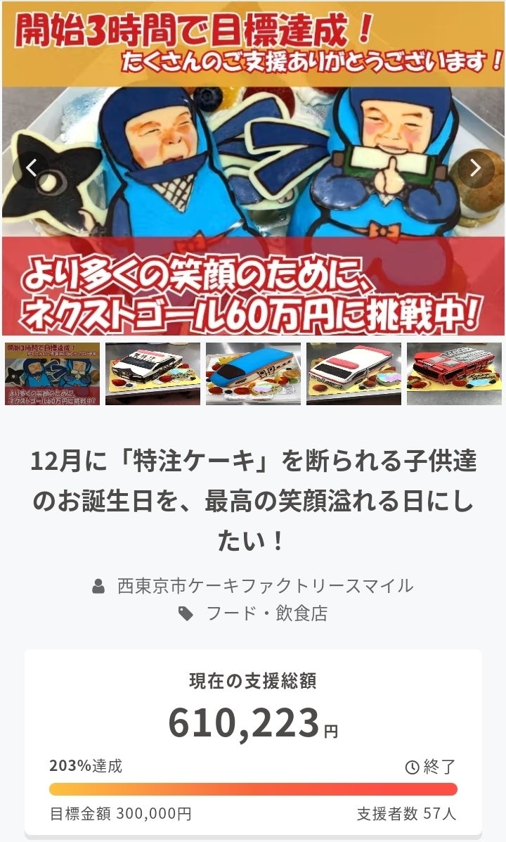 2022/11/09 11:15こんにちは!ケーキファクトリースマイルの吉川です!皆様のご支援、応援のおかげで、プロジェクトを、「達成率203% 610,223円」のご支援をいただき、終了することが出来ました!子どもたちを想う気持ちに共感していただき、応援していただけたことを、本当に嬉しく思います。この想いを、これから行動に移して、多くの方に「スマイル」を、届けていきます!ご支援いただいたリターンの準備に取り掛かり、できるだけ早くお届けできるようにいたします!この度は、本当にありがとうございました。今後の私共の活動も見守っていただけましたら幸いです。今後とも、よろしくお願いします。ケーキファクトリースマイル 吉川真介 もっと見る