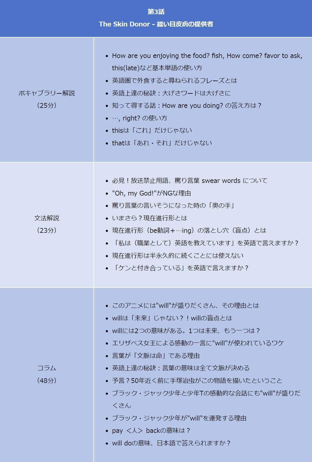 2004~2006年にかけて全国放送された全80話あるアニメ「ブラック・ジャック」の英語吹替え版から、3話をノーカットで収録。日常会話で頻出する英単語やフレーズ、重要文法が多く含まれるエピソードを厳選。アニメを楽しみながらリスニング力を高められます。