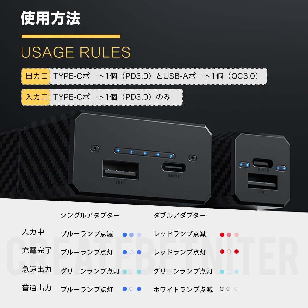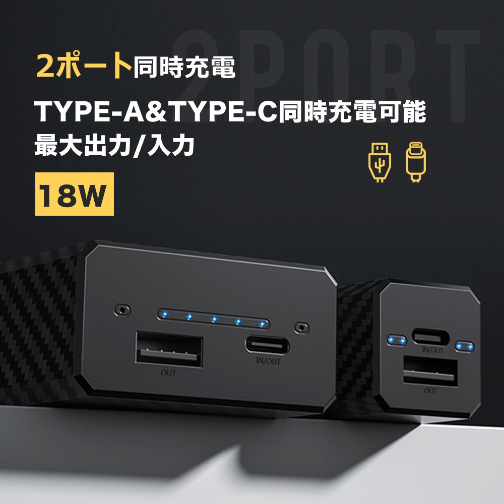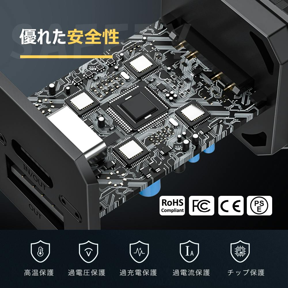 USB-AとType-C2ポート搭載しており、アンドロイドスマホ、アイホン、アイパッド、スイッチ等、様々な電子製品に対応しております。QC3.0とPD3.0どちらも対応、超スピードで充電するができます!