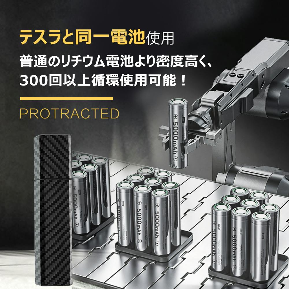 僅か84*25*25mmサイズ、口紅の大きさなのに、5000mAhの容量が入っております、秘密はテスラと同一21700電池を使用、普通のリチウム電池より密度高く、300回以上循環使用可能!