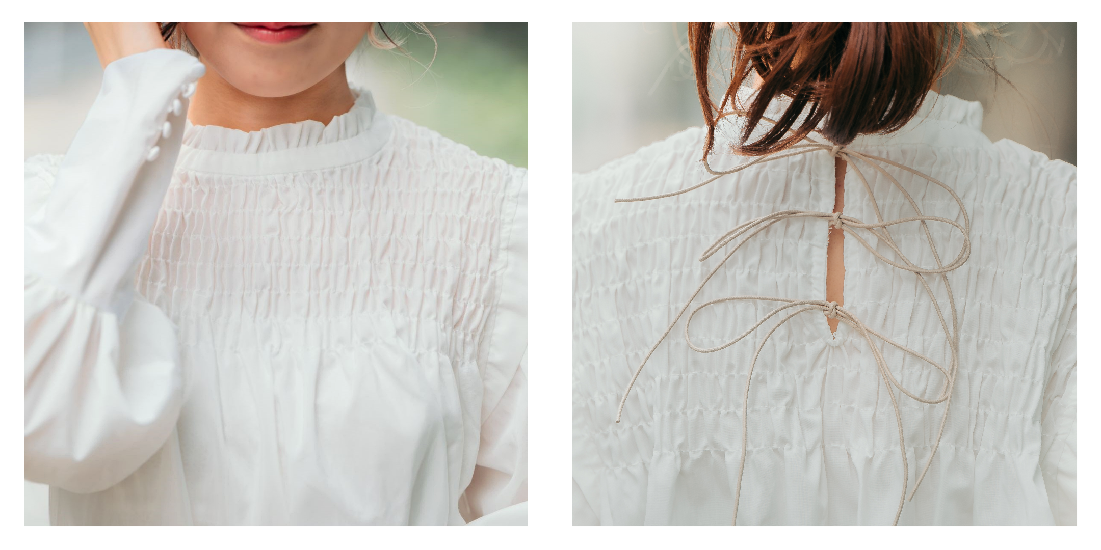 袖口のくるみボタンや背中のリボンが程よく甘い印象にしてくれます♥