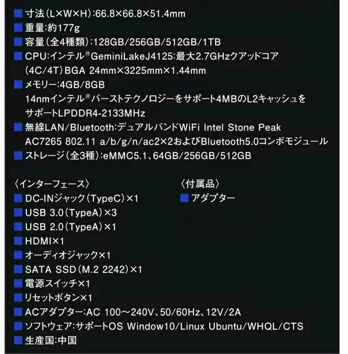 CPUはインテル®GeminiLakeJ4125のクアッドコアを採用、メモリーは最大8GB、ハードディスクは高速のSSDで最大1TB、ストレージもeMMC5.1を最大512GBまで拡張可能。