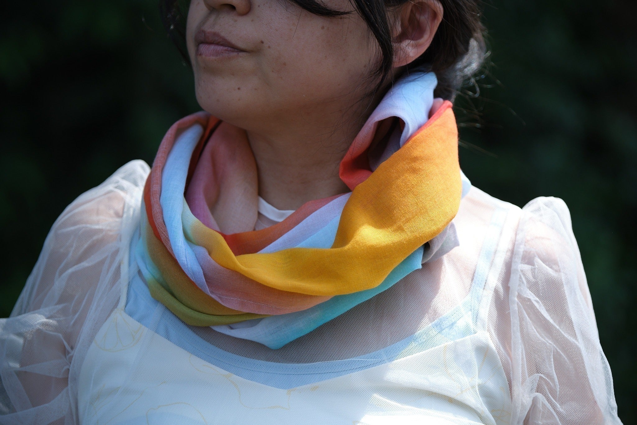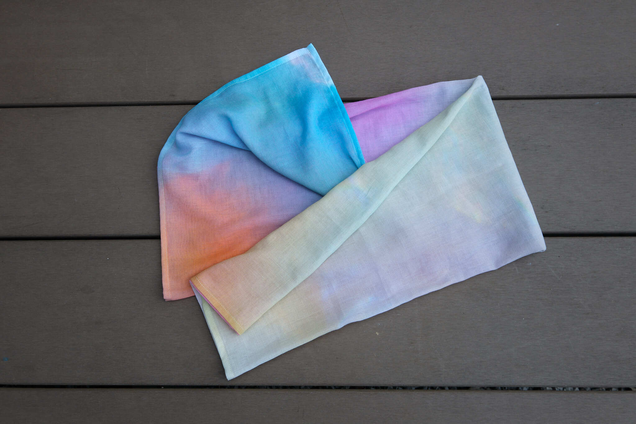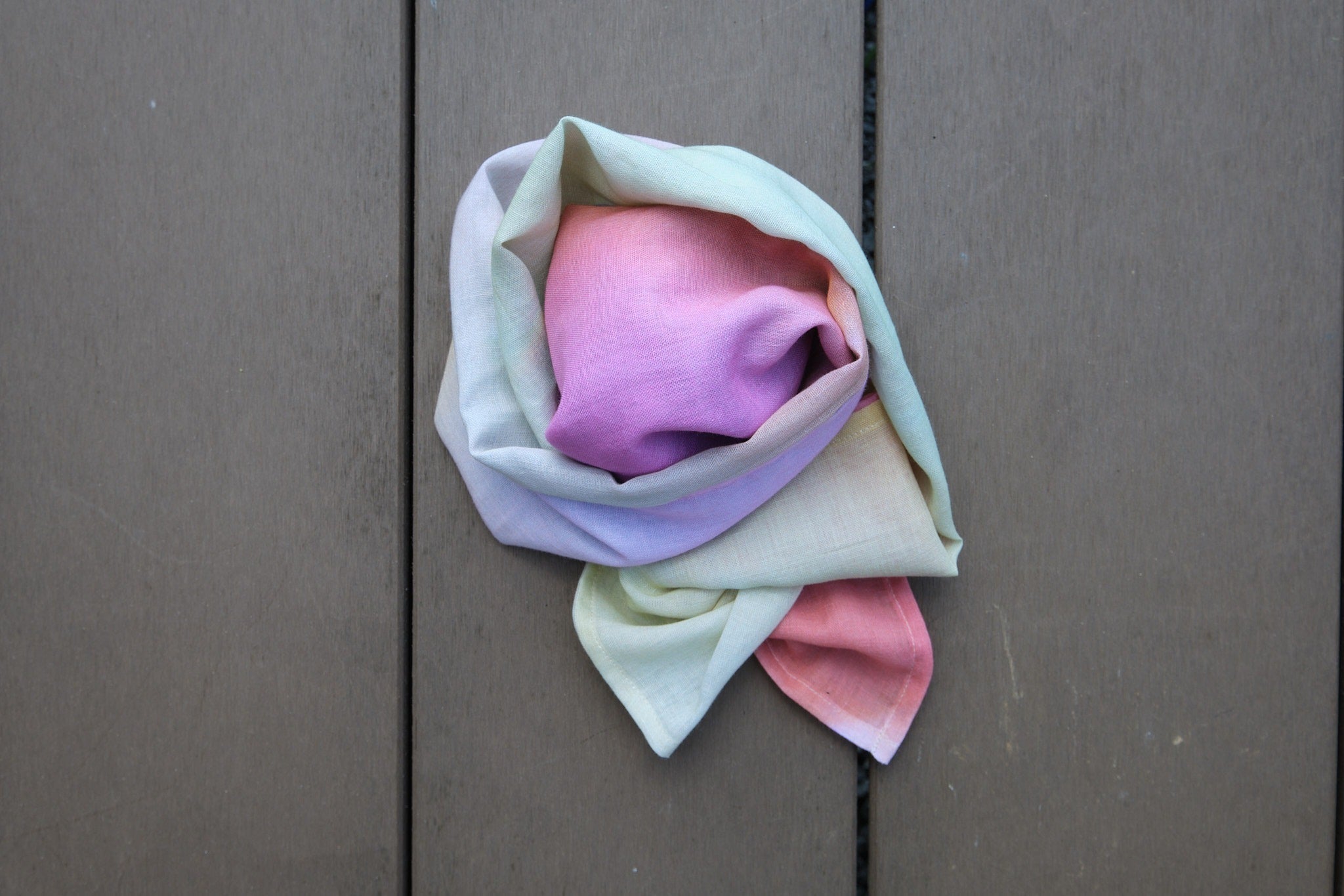 折る位置によって色の出方が変わるのでスカーフ、ストール以外にも帯締めやバックのハンドルに巻いたり、ヘアバンド・ターバンにして楽しむこともできますし、安心な日本製、肌触りも良いので正方形タイプは赤ちゃんのおくるみや敷いて撮影背景布としも使えますので他とは被らない出産祝い品としてもお薦めです