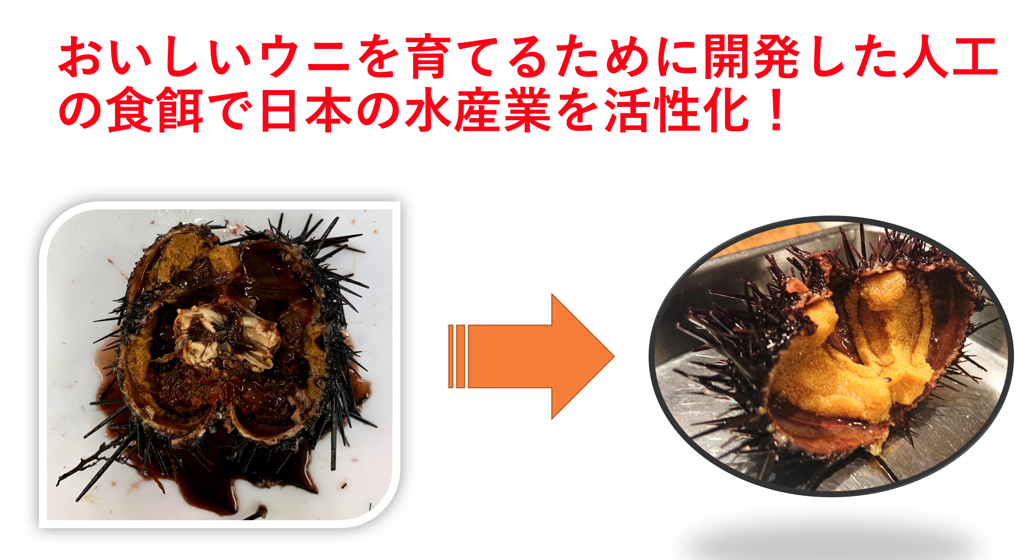 こんな美味しい「板ウニ」や「ウニ軍艦」が食べたいですね 我々は特に、二酸化炭素(ブルーカーボン)吸収に重要な、海藻を使わない「ウニの人工食餌」に着目し、ムラサキウニ、バフンウニ、アカウニ等の成長速度の増進、季節によらない旬を創造し、これまでにない最高に美味しい中身(生殖巣)をつくり、水産業界に旋風を起こしたいと考えています。
