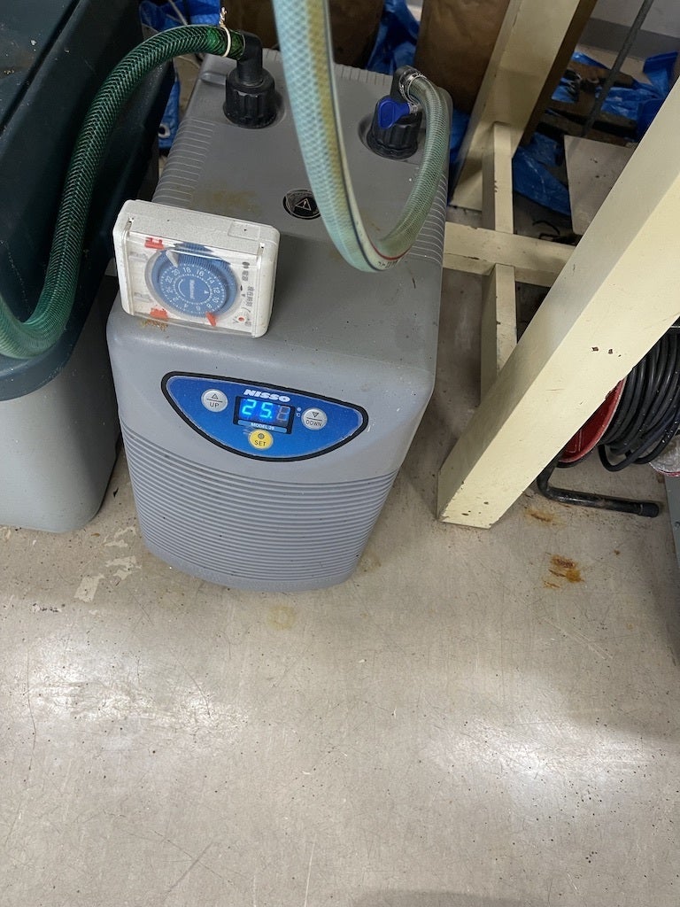 ウニ類の養殖に至適な海水温は我々の経験上、15〜25℃が良いので、この温度を維持する必要があります。現在は循環式水温コントローラーによって24〜25℃に海水温を維持していますが、今後大量に養殖する場合は地下の安定的な温度を利用してウニ等の養殖を行う計画が進行中です。地下水を用いて屋内温度コントロールを行っている企業と一緒に内陸部での養殖が可能かどうか検討を始めています。