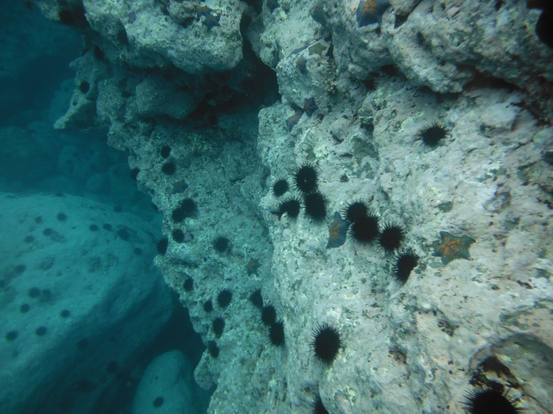 (海藻を食べ尽くし、異常増殖した中身(黄色い生殖巣)のないウニが、無毛化した岩場に大量に生存している状況、日本海)