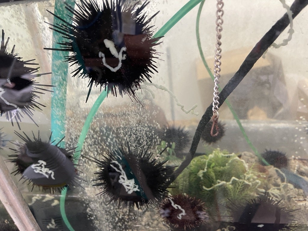 人工海水の水槽中で養殖中のウニとジェル状の人工食餌を食べている様子