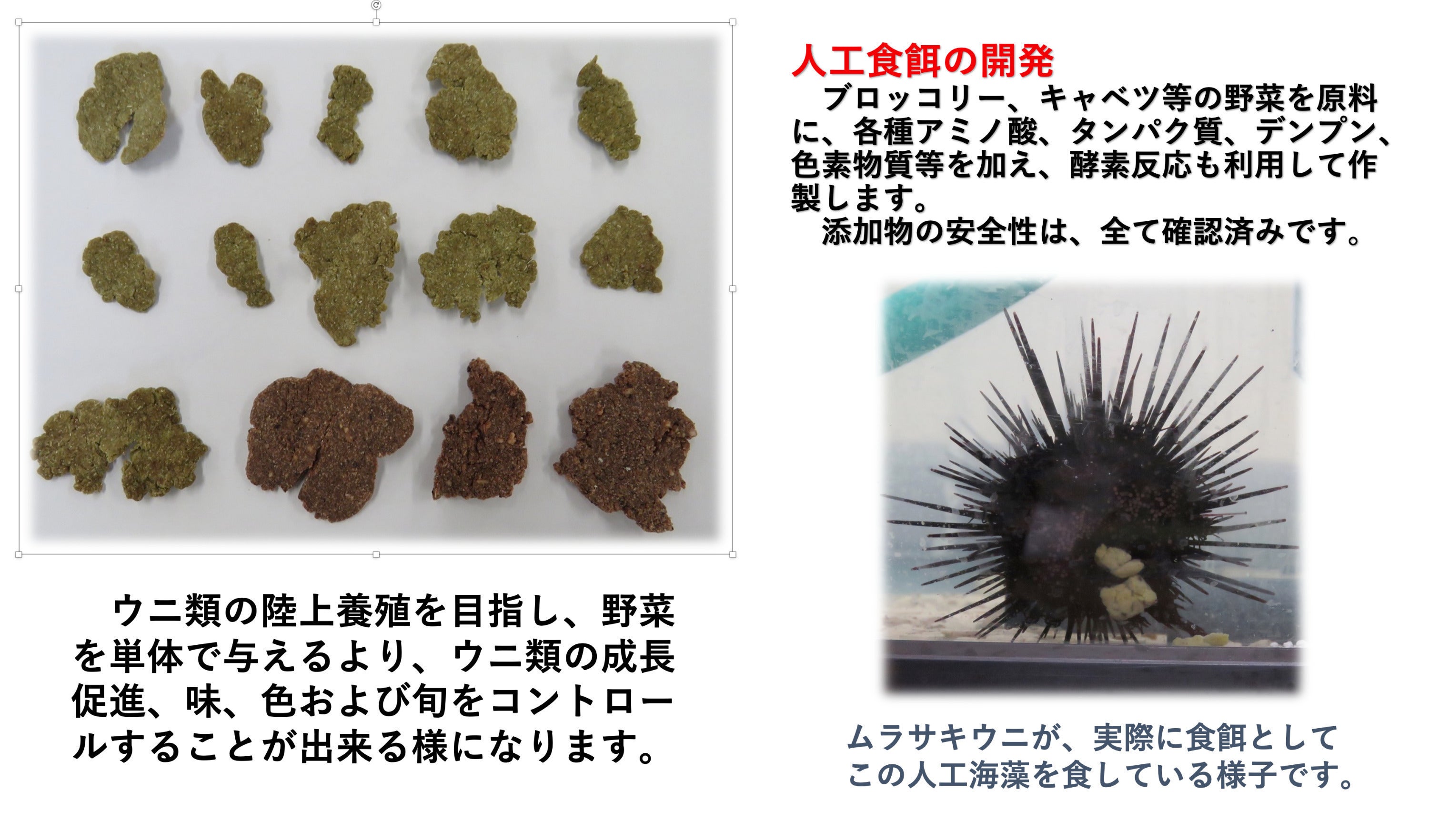 このプロジェクトでは、現在ウニの養殖で用いられている食餌(海藻のそのもの、海藻の端材、流れ藻、ブロッコリー、キャベツ、トマト等の野菜、クローバーなどの草木)と完全に異なり、粉砕した陸上野菜を基材に、酵素反応、遊離アミノ酸の種類や量のコントロール、タンパク質等の成長促進剤や天然色素などの食物栄養学で得られた知識の利用によって、食餌を作成しています。さらに、養殖用海水を汚濁せず、適度な比重を持ち海水中に均等に浮遊し、ウニの管足に容易に絡むことができる形状にすることが出来ています。