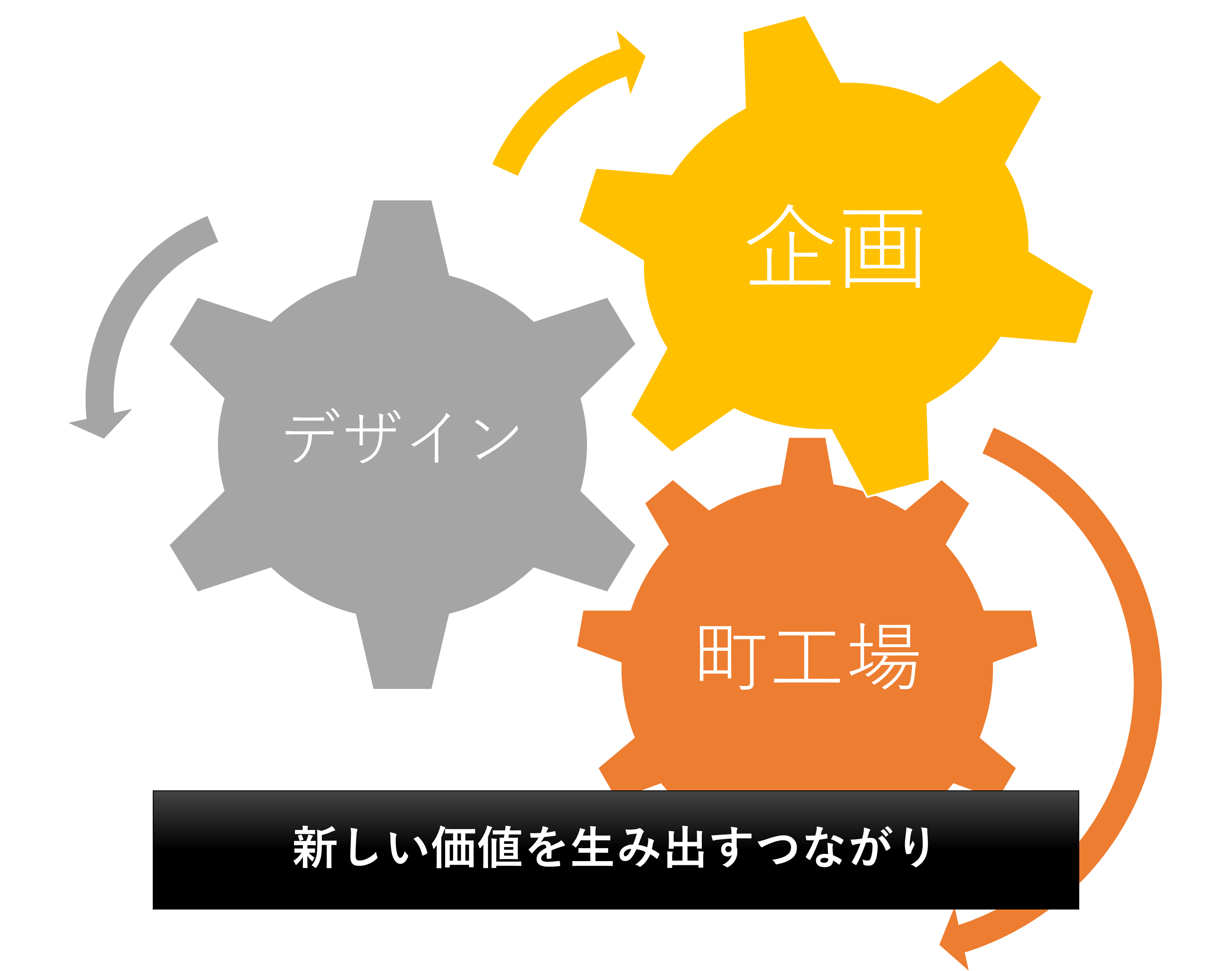 また、その他にもビジネスをつないでいくという意味も込められています。高い技術力を持った町工場は日本の大切な資産です。弊社は、技術を活かした商品企画をデザインパートナーと一緒に取り組み、物流、販売網を整えて世の中に送り出すサポートをしております。お互いの強みを生かし、今ある商品よりもっと機能的で斬新、付加価値の高い商品をお客様に提供し続けていきます。