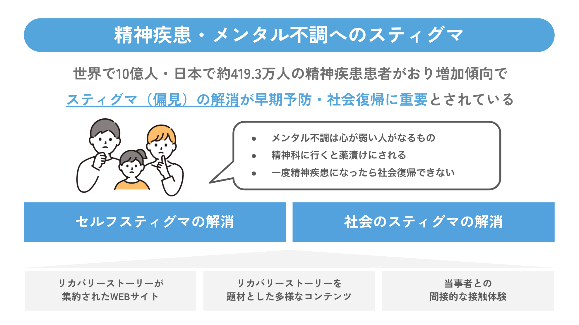精神疾患に対するスティグマの解消には、「正しい知識の教育」と「当事者との接触体験」が有効だとCorrigan PW氏らの『Challenging the public stigma of mental illness: a meta-analysis of outcome studies.』にて報告されています。
