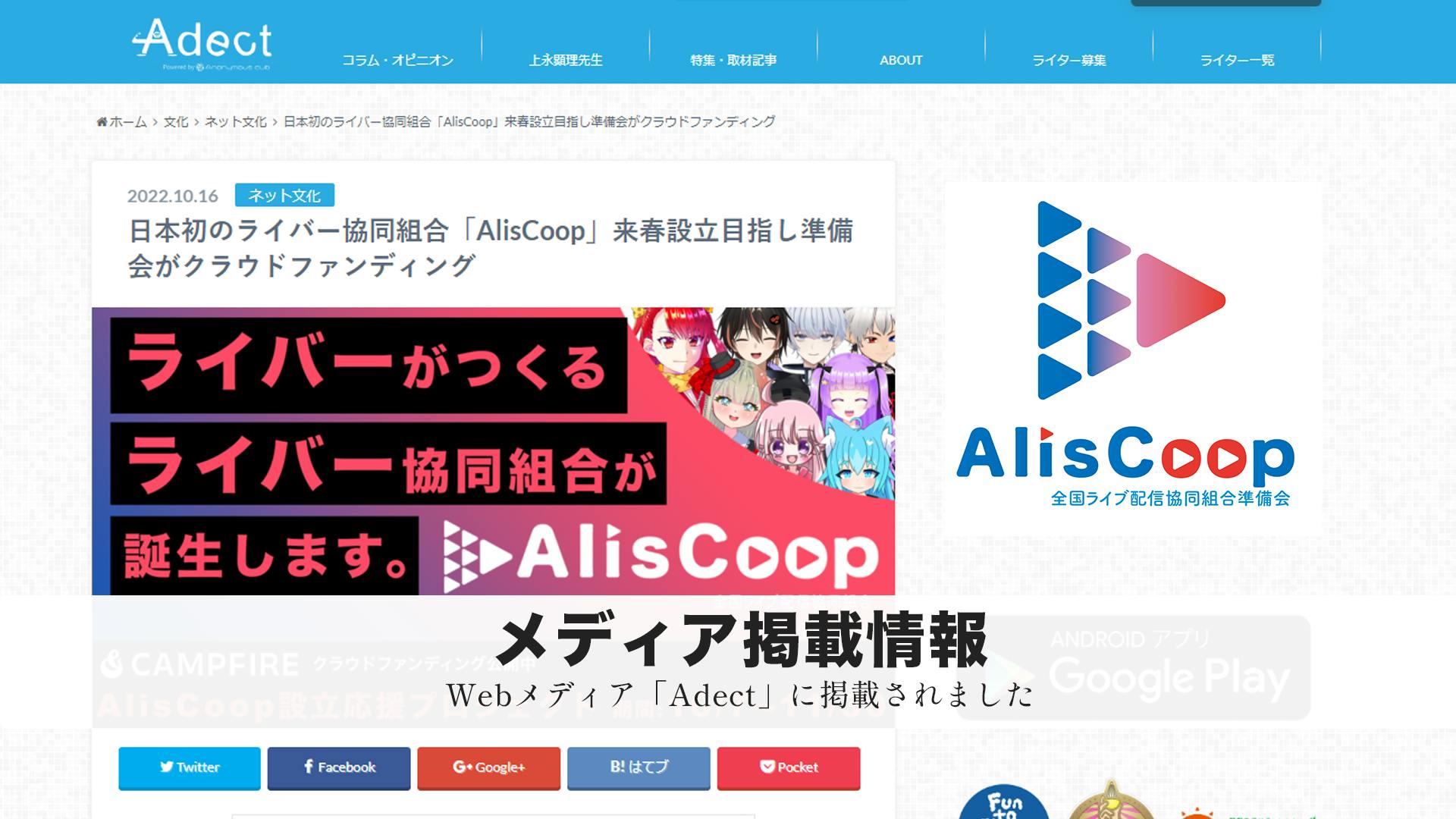 日本初のライバー協同組合「AlisCoop」来春設立目指し準備会がクラウドファンディング(Adect / アデクト)