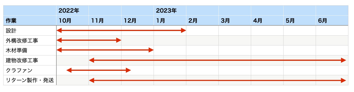 スケジュールはあくまで現在の状況による予定であり、工事の進捗状況等により変更の可能性がございます。 物品を伴うリターンなど可能なものについては、製作・準備が出来次第、随時前倒しでお送りいたします。支援者限定で随時配信される現場レポート動画と、工事完了後、複数回開催予定の支援者限定見学会については、工事完了が前倒しとなればその分短い期間のレポート動画配信になる可能性および早い時期での見学会の実施、また完了が遅れた場合には、長い期間のレポート動画配信および遅い時期での見学会の実施の可能性がございます(数ヶ月程度のズレを想定)。そのため、お届け時期の表記については、現場レポート動画と支援者限定見学会、また相談の上決定する講演・レクチャーの日程を含まない表記とさせていただきました。