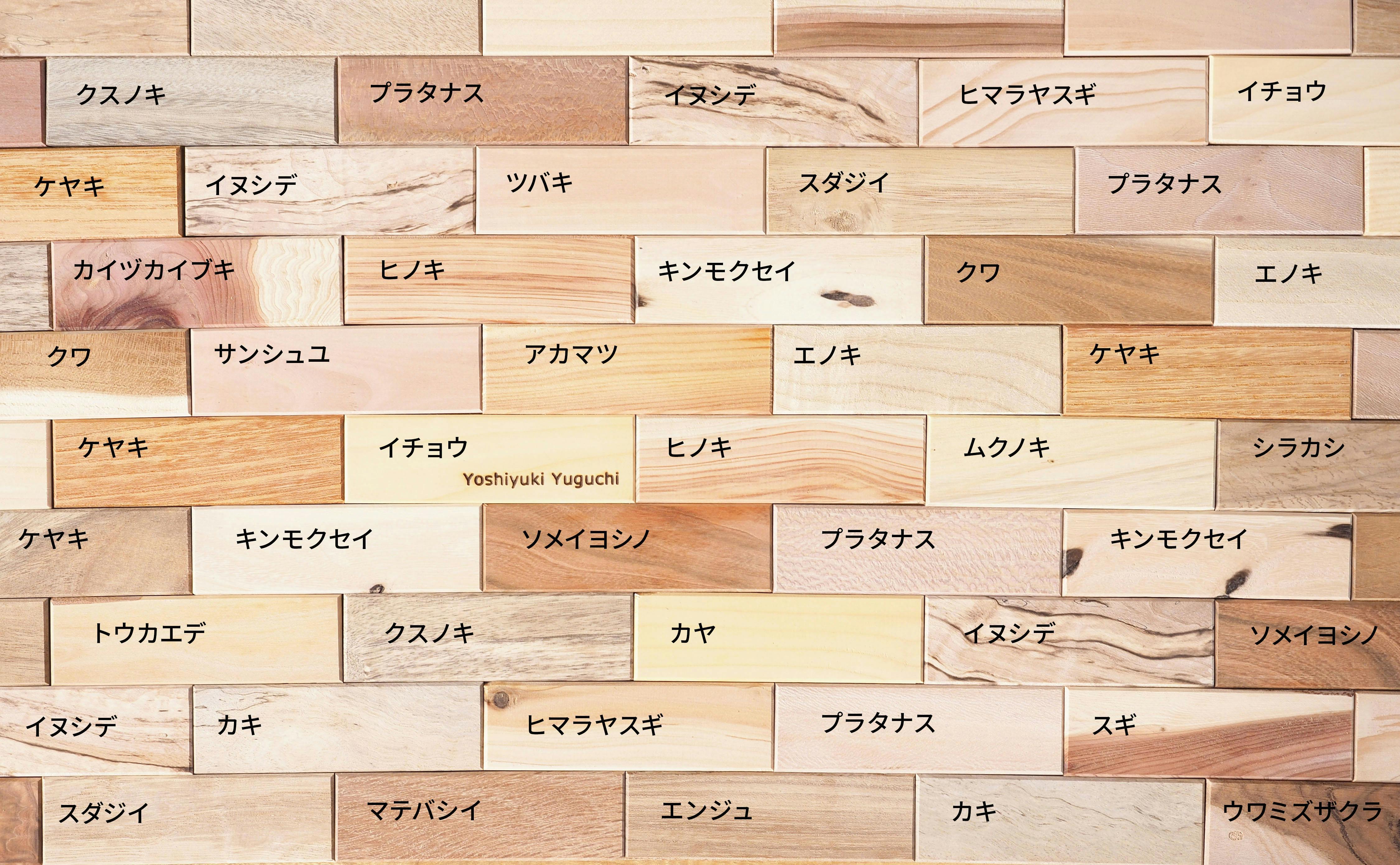 銘板に使用する樹種は数十樹種、色とりどりの樹種が色々な人の関わりで大集合して、ひとつの美しい壁が完成いたします。