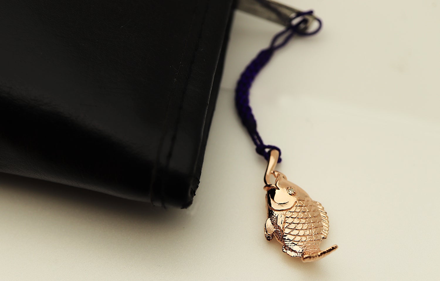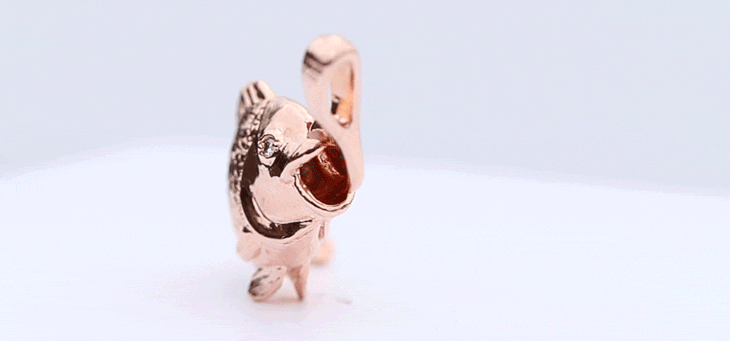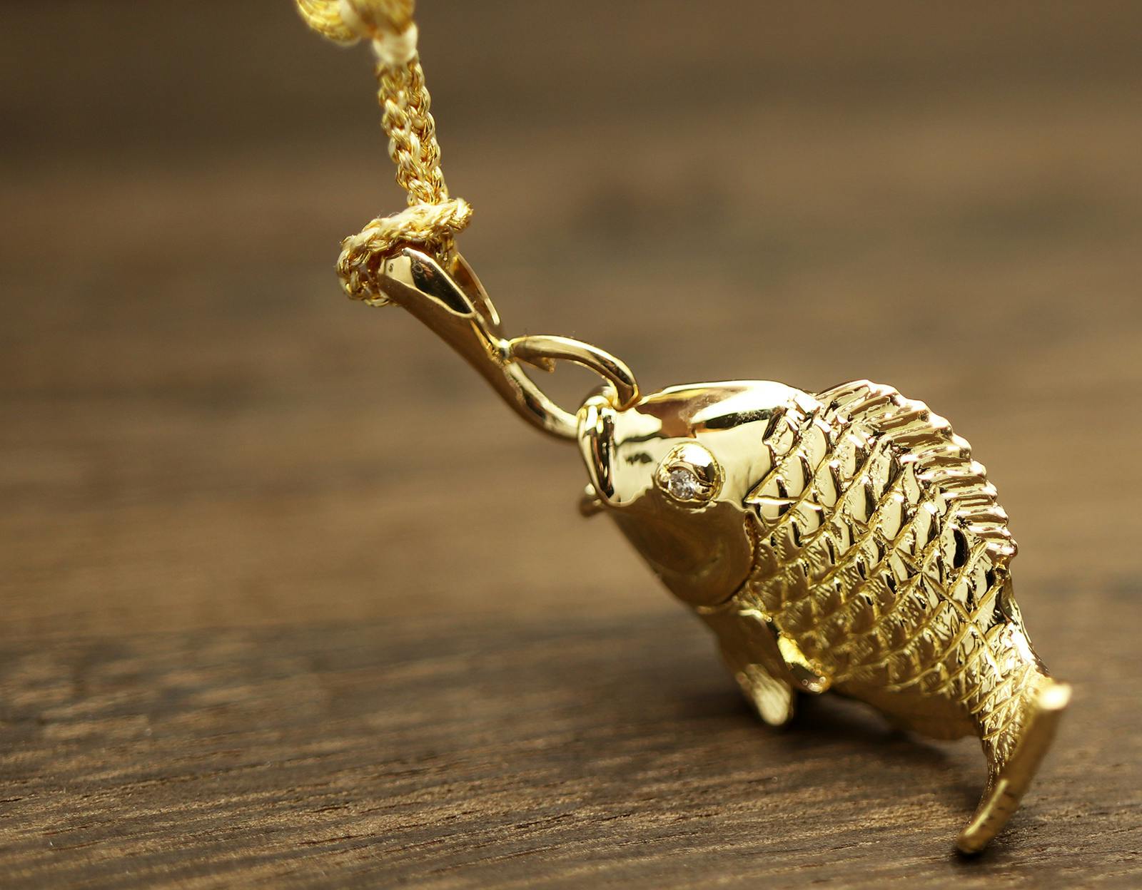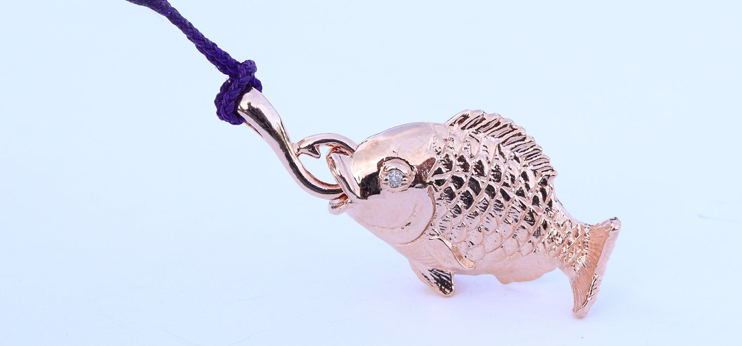 お金が貯まりそうな根付です。しかも、紐を通す部分は釣り針デザインなので「大金吊り上げる!」という幸運な根付になっています。