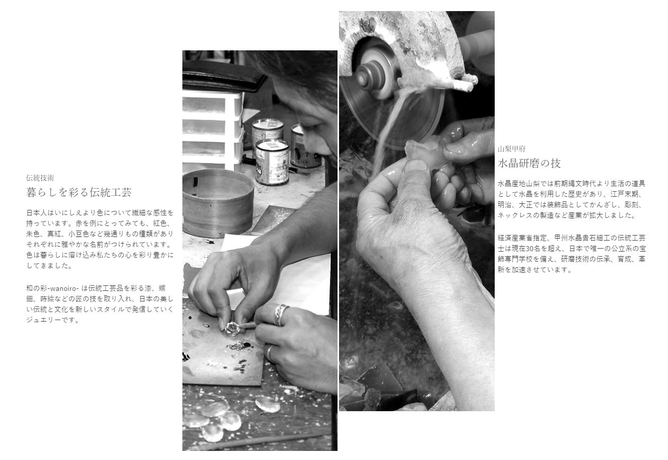 山梨の宝飾産業は「水晶工芸、水晶研磨」と「貴金属工芸」のふたつの流れから発展してきた歴史があります。この地で磨かれた感性と技を活かし、時代のニーズに合った信頼できる商品をご提供してまいります。