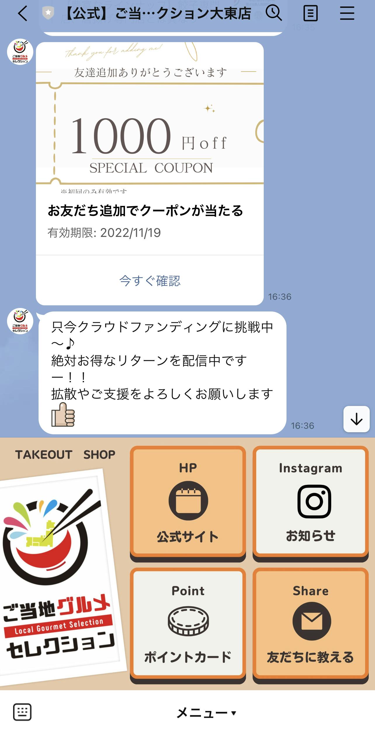 2022/11/12 16:55【LINE公式アカウント開設のお知らせ】こんにちは!この度LINE公式アカウントを開設しましたのでお知らせ致しますー!!友だち追加時には・・・。クーポンが当たる抽選も!!友だち追加はこちらからできます~♪まだまだ残り期間がありますのでジャンジャン拡散と沢山のご支援お待ちしておりますーー!! もっと見る