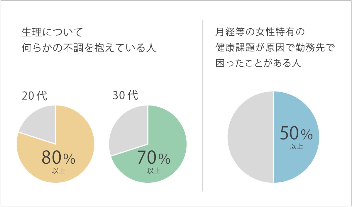 実は生理について何らかの不調を抱えている人は、20代で80%以上、 30代で70%以上もいます。(※1)