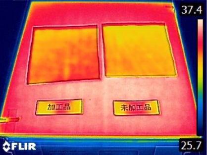 40℃に加熱したホットプレートの上にTERAX加工をした生地と、未加工の生地を乗せ比較検査を行いました。TERAX加工をしたほうが生地表面が赤くなって温度が高く、つまり遠赤外線量が高いことがわかります。
