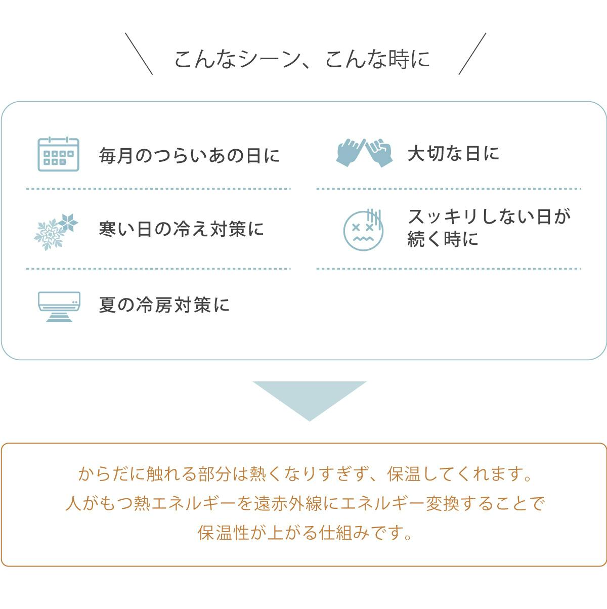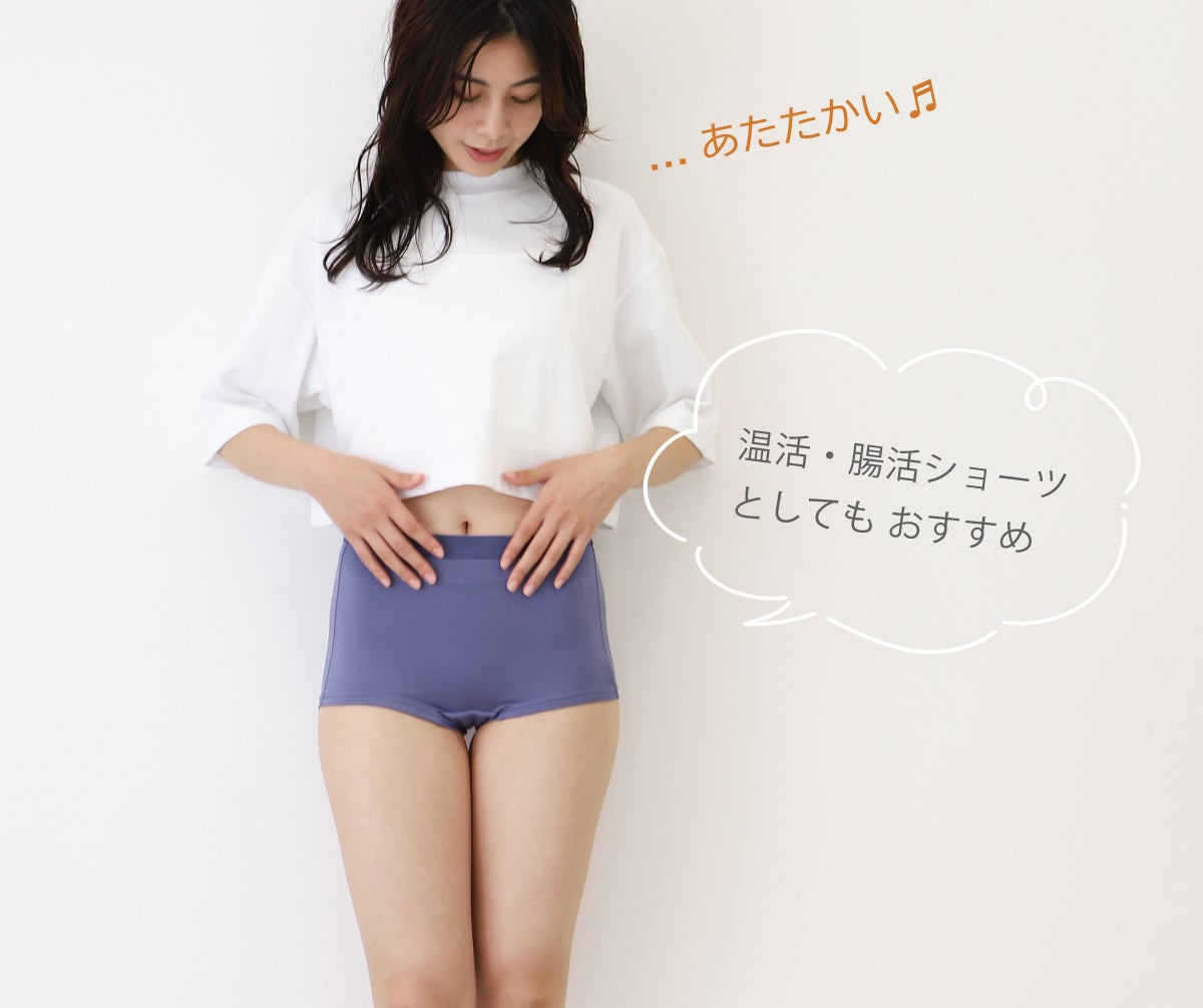 最大の特徴は”触れる部分が熱くなりすぎず保温する”ことなので、夏場の着用も可能です。 また、温めることで腸の活性化が期待できます。スッキリしない日が続く方には温活・腸活ショーツとしての着用もオススメです。